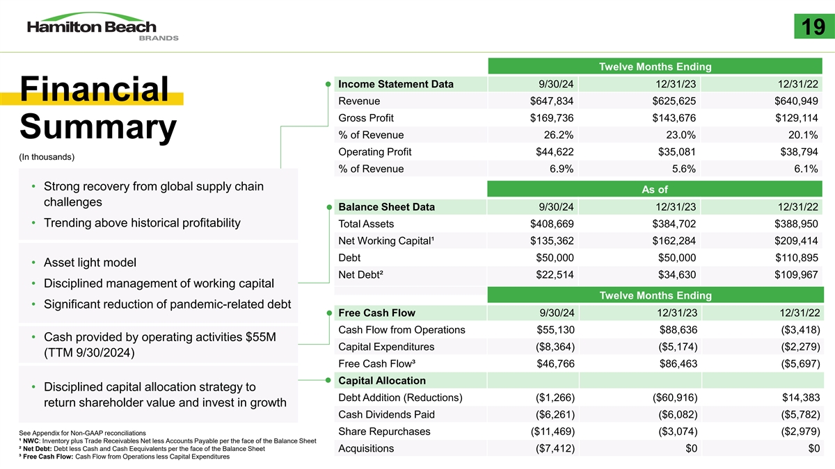 19 Twelve Months Ending Income Statement Data 9/30/24 12/31/23 12/31/22 Financial Revenue $647,834 $625,625 $640,949 Gross Profit $169,736 $143,676 $129,114 Summary % of Revenue 26.2% 23.0% 20.1% Operating Profit $44,622 $35,081 $38,794 (In thousands) % of Revenue 6.9% 5.6% 6.1% • Strong recovery from global supply chain As of challenges Balance Sheet Data 9/30/24 12/31/23 12/31/22 • Trending above historical profitability Total Assets $408,669 $384,702 $388,950 Net Working Capital¹ $135,362 $162,284 $209,414 Debt $50,000 $50,000 $110,895 • Asset light model Net Debt² $22,514 $34,630 $109,967 • Disciplined management of working capital Twelve Months Ending • Significant reduction of pandemic-related debt Free Cash Flow 9/30/24 12/31/23 12/31/22 Cash Flow from Operations $55,130 $88,636 ($3,418) • Cash provided by operating activities $55M Capital Expenditures ($8,364) ($5,174) ($2,279) (TTM 9/30/2024) Free Cash Flow³ $46,766 $86,463 ($5,697) Capital Allocation • Disciplined capital allocation strategy to Debt Addition (Reductions) ($1,266) ($60,916) $14,383 return shareholder value and invest in growth Cash Dividends Paid ($6,261) ($6,082) ($5,782) See Appendix for Non-GAAP reconciliations Share Repurchases ($11,469) ($3,074) ($2,979) ¹ NWC: Inventory plus Trade Receivables Net less Accounts Payable per the face of the Balance Sheet ² Net Debt: Debt less Cash and Cash Eequivalents per the face of the Balance Sheet Acquisitions ($7,412) $0 $0 ³ Free Cash Flow: Cash Flow from Operations less Capital Expenditures