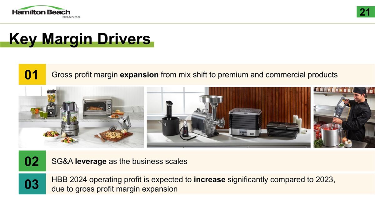 20 Revenue Growth Roadmap Fastest growing areas of HBB's Growth driven by business are expected to be: 6 key strategic • Premium • Commercial initiatives • Health In 2024, the Small Kitchen Appliance market in North America is expected to be above 2023 and that trend is expected to continue in 2025 HBB 2024 total revenue is expected to increase modestly over 2023, outpacing the market due to progress with strategic initiatives