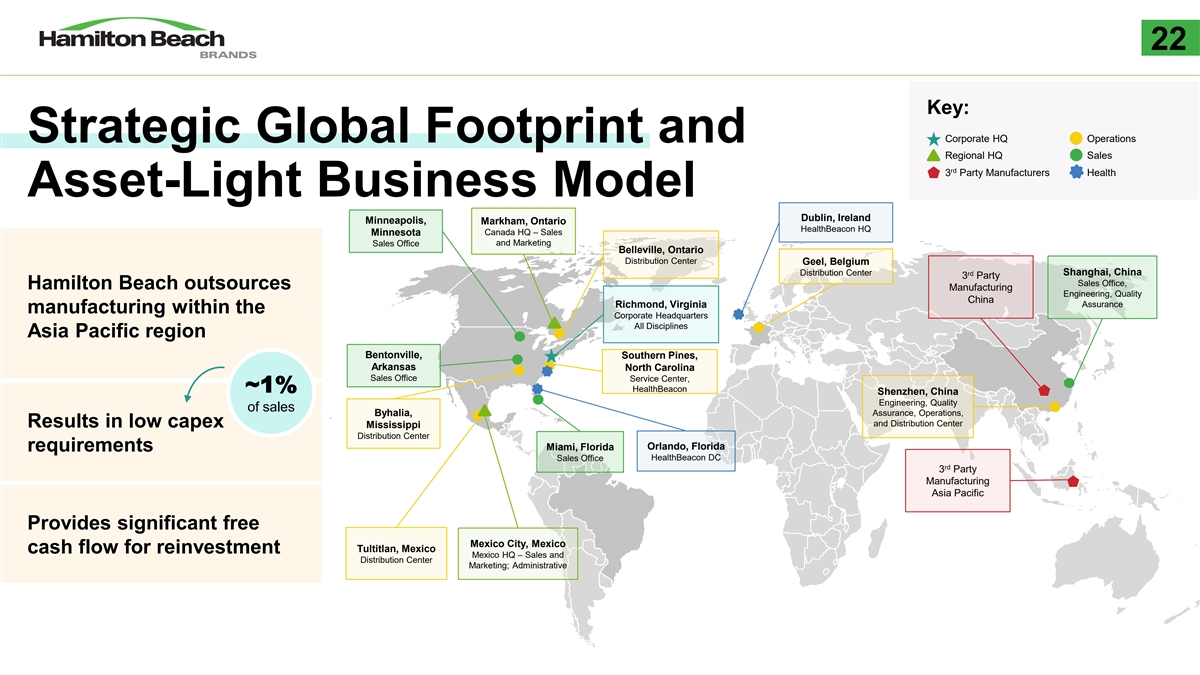 22 Key: Strategic Global Footprint and Corporate HQ Operations Regional HQ Sales rd 3 Party Manufacturers Health Asset-Light Business Model Dublin, Ireland Minneapolis, Markham, Ontario HealthBeacon HQ Canada HQ – Sales Minnesota Sales Office and Marketing Belleville, Ontario Distribution Center Geel, Belgium Shanghai, China Distribution Center rd 3 Party Sales Office, Hamilton Beach outsources Manufacturing Engineering, Quality China Richmond, Virginia Assurance manufacturing within the Corporate Headquarters All Disciplines Asia Pacific region Bentonville, Southern Pines, Arkansas North Carolina Sales Office Service Center, ~1% HealthBeacon Shenzhen, China Engineering, Quality of sales Byhalia, Assurance, Operations, and Distribution Center Results in low capex Mississippi Distribution Center Orlando, Florida requirements Miami, Florida Sales Office HealthBeacon DC rd 3 Party Manufacturing Asia Pacific Provides significant free Mexico City, Mexico Tultitlan, Mexico cash flow for reinvestment Mexico HQ – Sales and Distribution Center Marketing; Administrative