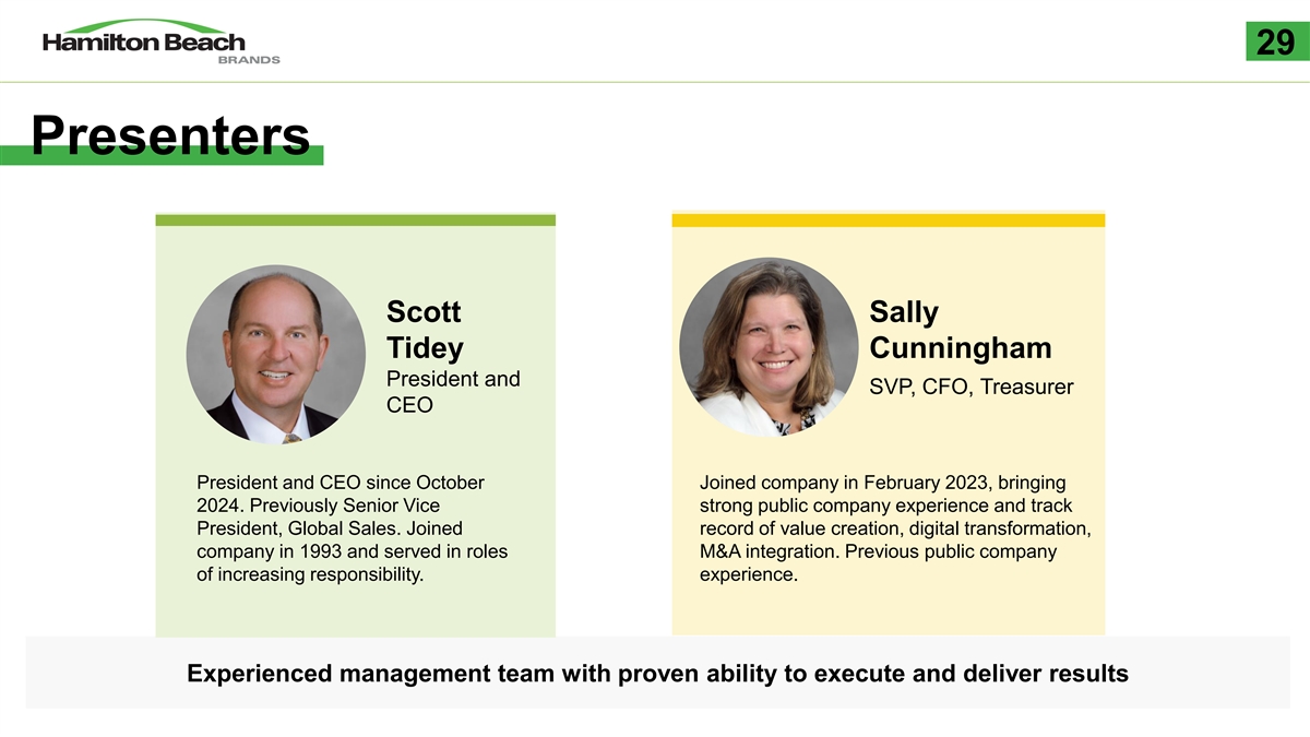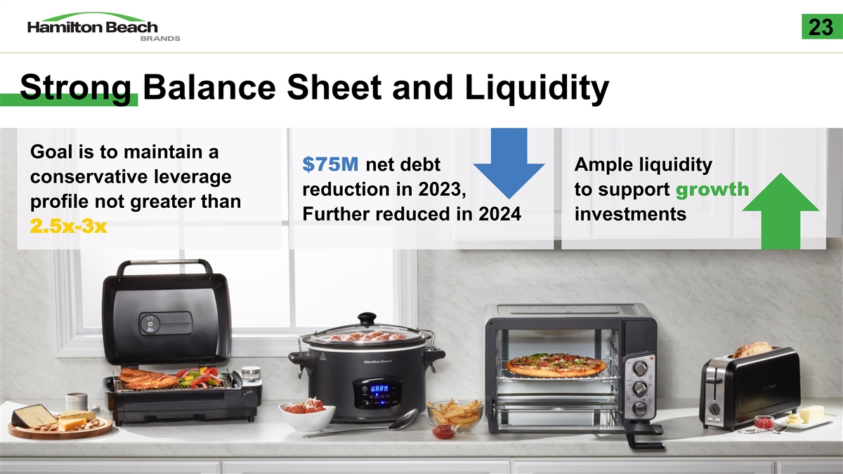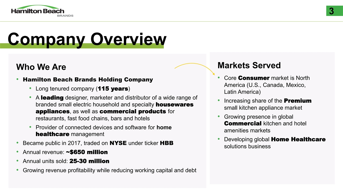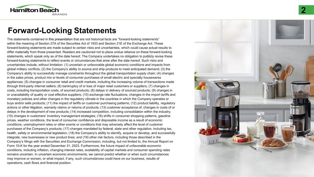 2 Forward-Looking Statements The statements contained in this presentation that are not historical facts are “forward-looking statements” within the meaning of Section 27A of the Securities Act of 1933 and Section 21E of the Exchange Act. These forward-looking statements are made subject to certain risks and uncertainties, which could cause actual results to differ materially from those presented. Readers are cautioned not to place undue reliance on these forward-looking statements, which speak only as of the date hereof. The Company undertakes no obligation to publicly revise these forward-looking statements to reflect events or circumstances that arise after the date hereof. Such risks and uncertainties include, without limitation: (1) uncertain or unfavorable global economic conditions and impacts from global military conflicts; (2) the Company’s ability to source and ship products to meet anticipated demand; (3) the Company’s ability to successfully manage constraints throughout the global transportation supply chain; (4) changes in the sales prices, product mix or levels of consumer purchases of small electric and specialty housewares appliances; (5) changes in consumer retail and credit markets, including the increasing volume of transactions made through third-party internet sellers; (6) bankruptcy of or loss of major retail customers or suppliers; (7) changes in costs, including transportation costs, of sourced products; (8) delays in delivery of sourced products; (9) changes in or unavailability of quality or cost effective suppliers; (10) exchange rate fluctuations, changes in the import tariffs and monetary policies and other changes in the regulatory climate in the countries in which the Company operates or buys and/or sells products; (11) the impact of tariffs on customer purchasing patterns; (12) product liability, regulatory actions or other litigation, warranty claims or returns of products; (13) customer acceptance of, changes in costs of or delays in the development of new products; (14) increased competition, including consolidation within the industry; (15) changes in customers’ inventory management strategies; (16) shifts in consumer shopping patterns, gasoline prices, weather conditions, the level of consumer confidence and disposable income as a result of economic conditions, unemployment rates or other events or conditions that may adversely affect the level of customer purchases of the Company’s products; (17) changes mandated by federal, state and other regulation, including tax, health, safety or environmental legislation; (18) the Company’s ability to identify, acquire or develop, and successfully integrate, new businesses or new product lines; and (19) other risk factors, including those described in the Company’s filings with the Securities and Exchange Commission, including, but not limited to, the Annual Report on Form 10-K for the year ended December 31, 2023. Furthermore, the future impact of unfavorable economic conditions, including inflation, changing interest rates, availability of capital markets and consumer spending rates remains uncertain. In uncertain economic environments, we cannot predict whether or when such circumstances may improve or worsen, or what impact, if any, such circumstances could have on our business, results of operations, cash flows and financial position.