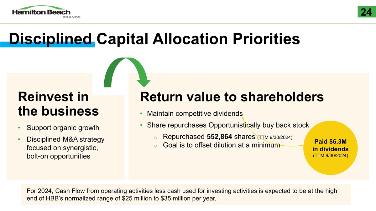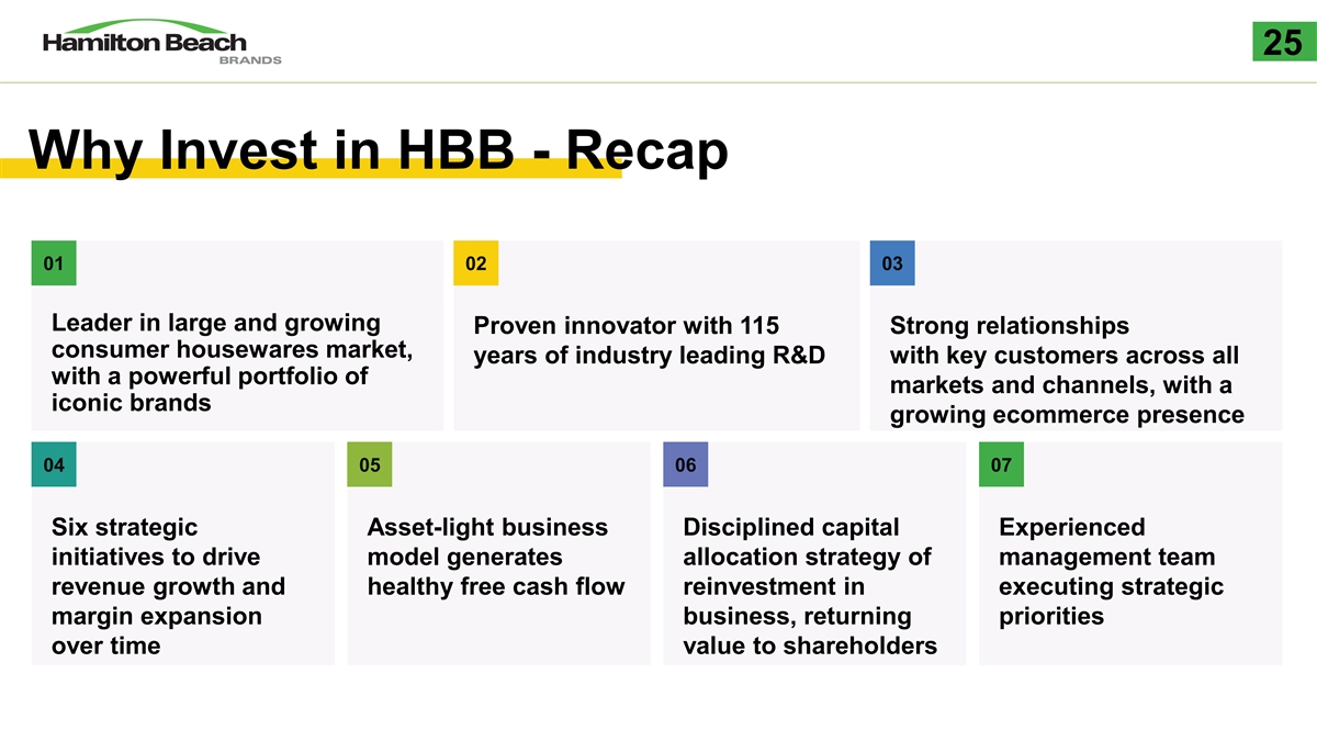 24 Disciplined Capital Allocation Priorities Reinvest in Return value to shareholders the business • Maintain competitive dividends • Share repurchases Opportunistically buy back stock • Support organic growth o Repurchased 552,864 shares (TTM 9/30/2024) • Disciplined M&A strategy Paid $6.3M o Goal is to offset dilution at a minimum focused on synergistic, in dividends (TTM 9/30/2024) bolt-on opportunities For 2024, Cash Flow from operating activities less cash used for investing activities is expected to be at the high end of HBB’s normalized range of $25 million to $35 million per year.
