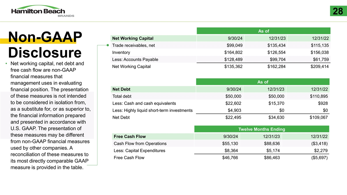 28 As of Net Working Capital 9/30/24 12/31/23 12/31/22 Non-GAAP Trade receivables, net $99,049 $135,434 $115,135 Inventory $164,802 $126,554 $156,038 Disclosure Less: Accounts Payable $128,489 $99,704 $61,759 • Net working capital, net debt and Net Working Capital $135,362 $162,284 $209,414 free cash flow are non-GAAP financial measures that As of management uses in evaluating Net Debt 9/30/24 12/31/23 12/31/22 financial position. The presentation of these measures is not intended Total debt $50,000 $50,000 $110,895 to be considered in isolation from, Less: Cash and cash equivalents $22,602 $15,370 $928 as a substitute for, or as superior to, Less: Highly liquid short-term investments $4,903 $0 $0 the financial information prepared Net Debt $22,495 $34,630 $109,067 and presented in accordance with U.S. GAAP. The presentation of Twelve Months Ending these measures may be different Free Cash Flow 9/30/24 12/31/23 12/31/22 from non-GAAP financial measures Cash Flow from Operations $55,130 $88,636 ($3,418) used by other companies. A Less: Capital Expenditures $8,364 $5,174 $2,279 reconciliation of these measures to Free Cash Flow $46,766 $86,463 ($5,697) its most directly comparable GAAP measure is provided in the table.