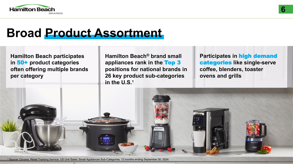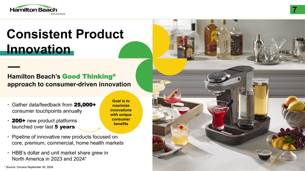 6 Broad Product Assortment ® Participates in high demand Hamilton Beach participates Hamilton Beach brand small in 50+ product categories appliances rank in the Top 3 categories like single-serve often offering multiple brands positions for national brands in coffee, blenders, toaster per category 26 key product sub-categories ovens and grills in the U.S.¹ ¹ Source: Circana, Retail Tracking Service, US Unit Sales, Small Appliances Sub-Categories, 12 months ending September 30, 2024