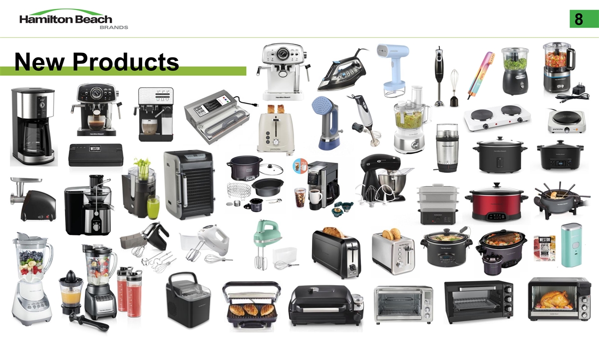 7 Consistent Product Innovation ® Hamilton Beach’s Good Thinking approach to consumer-driven innovation Goal is to • Gather data/feedback from 25,000+ maximize innovations consumer touchpoints annually with unique consumer • 200+ new product platforms benefits launched over last 5 years • Pipeline of innovative new products focused on core, premium, commercial, home health markets • HBB’s dollar and unit market share grew in North America in 2023 and 2024¹ ¹ Source: Circana September 30, 2024