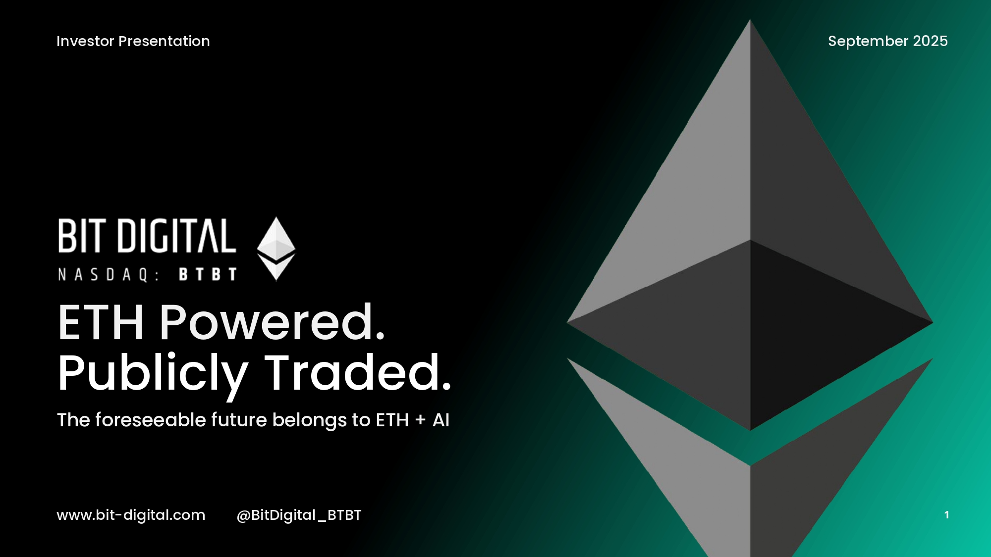 1 ETH Powered. Publicly Traded. The foreseeable future belongs to ETH + AI www.bit - digital.com Investor Presentation @BitDigital_BTBT September 2025