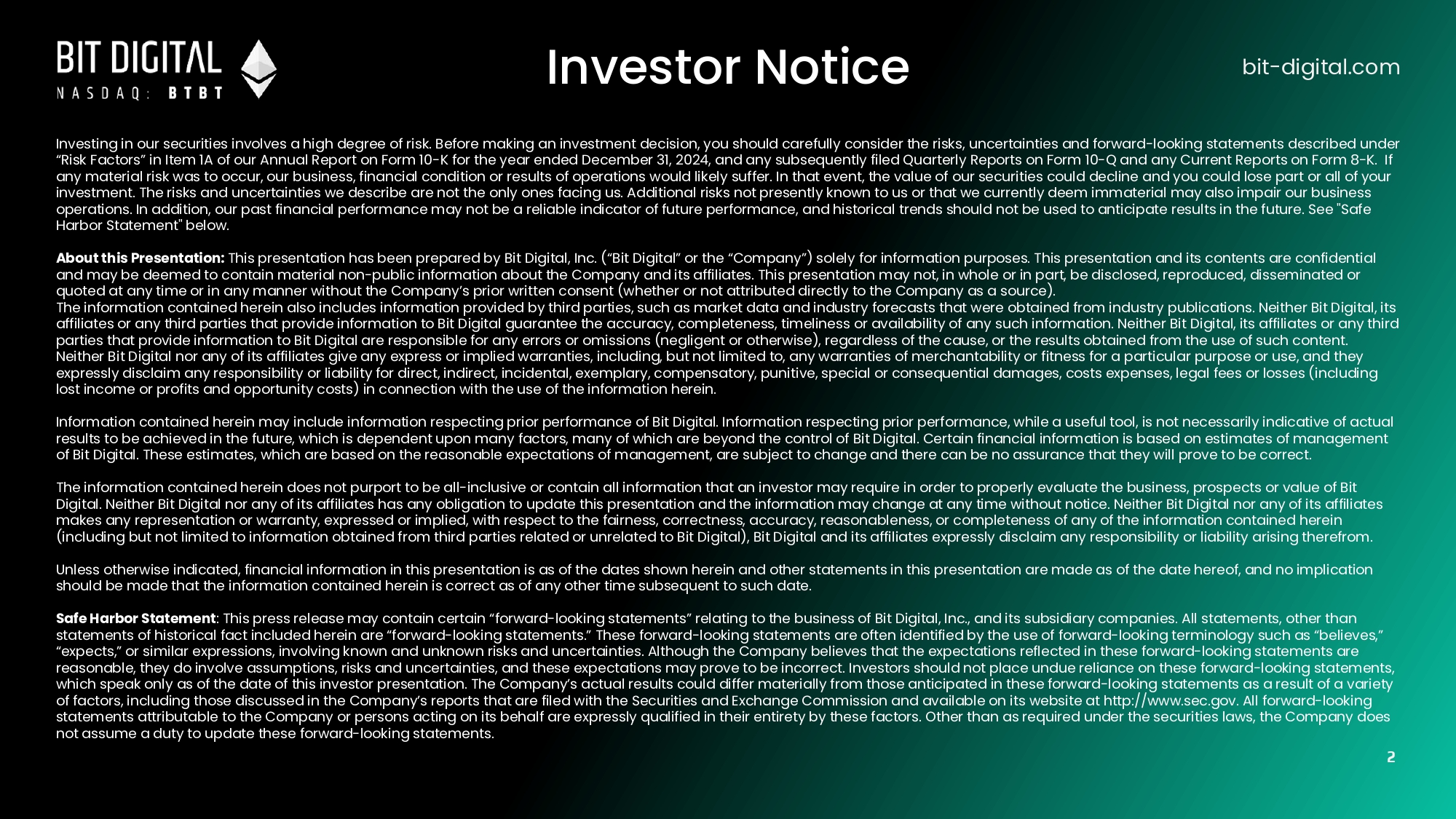 Investing in our securities involves a high degree of risk. Before making an investment decision, you should carefully consider the risks, uncertainties and forward - looking statements described under “Risk Factors” in Item 1A of our Annual Report on Form 10 - K for the year ended December 31, 2024, and any subsequently filed Quarterly Reports on Form 10 - Q and any Current Reports on Form 8 - K. If any material risk was to occur, our business, financial condition or results of operations would likely suffer. In that event, the value of our securities could decline and you could lose part or all of your investment. The risks and uncertainties we describe are not the only ones facing us. Additional risks not presently known to us or that we currently deem immaterial may also impair our business operations. In addition, our past financial performance may not be a reliable indicator of future performance, and historical trends should not be used to anticipate results in the future. See "Safe Harbor Statement" below. About this Presentation: This presentation has been prepared by Bit Digital, Inc. (“Bit Digital” or the “Company”) solely for information purposes. This presentation and its contents are confidential and may be deemed to contain material non - public information about the Company and its affiliates. This presentation may not, in whole or in part, be disclosed, reproduced, disseminated or quoted at any time or in any manner without the Company’s prior written consent (whether or not attributed directly to the Company as a source). The information contained herein also includes information provided by third parties, such as market data and industry forecasts that were obtained from industry publications . Neither Bit Digital, its affiliates or any third parties that provide information to Bit Digital guarantee the accuracy, completeness, timeliness or availability of any such information . Neither Bit Digital, its affiliates or any third parties that provide information to Bit Digital are responsible for any errors or omissions (negligent or otherwise), regardless of the cause, or the results obtained from the use of such content . Neither Bit Digital nor any of its affiliates give any express or implied warranties, including, but not limited to, any warranties of merchantability or fitness for a particular purpose or use, and they expressly disclaim any responsibility or liability for direct, indirect, incidental, exemplary, compensatory, punitive, special or consequential damages, costs expenses, legal fees or losses (including lost income or profits and opportunity costs) in connection with the use of the information herein. Information contained herein may include information respecting prior performance of Bit Digital. Information respecting prior performance, while a useful tool, is not necessarily indicative of actual results to be achieved in the future, which is dependent upon many factors, many of which are beyond the control of Bit Digital. Certain financial information is based on estimates of management of Bit Digital. These estimates, which are based on the reasonable expectations of management, are subject to change and there can be no assurance that they will prove to be correct. The information contained herein does not purport to be all - inclusive or contain all information that an investor may require in order to properly evaluate the business, prospects or value of Bit Digital. Neither Bit Digital nor any of its affiliates has any obligation to update this presentation and the information may change at any time without notice. Neither Bit Digital nor any of its affiliates makes any representation or warranty, expressed or implied, with respect to the fairness, correctness, accuracy, reasonableness, or completeness of any of the information contained herein (including but not limited to information obtained from third parties related or unrelated to Bit Digital), Bit Digital and its affiliates expressly disclaim any responsibility or liability arising therefrom. Unless otherwise indicated, financial information in this presentation is as of the dates shown herein and other statements in this presentation are made as of the date hereof, and no implication should be made that the information contained herein is correct as of any other time subsequent to such date. Safe Harbor Statement : This press release may contain certain “forward - looking statements” relating to the business of Bit Digital, Inc., and its subsidiary companies. All statements, other than statements of historical fact included herein are “forward - looking statements.” These forward - looking statements are often identified by the use of forward - looking terminology such as “believes,” “expects,” or similar expressions, involving known and unknown risks and uncertainties. Although the Company believes that the expectations reflected in these forward - looking statements are reasonable, they do involve assumptions, risks and uncertainties, and these expectations may prove to be incorrect. Investors should not place undue reliance on these forward - looking statements, which speak only as of the date of this investor presentation. The Company’s actual results could differ materially from those anticipated in these forward - looking statements as a result of a variety of factors, including those discussed in the Company’s reports that are filed with the Securities and Exchange Commission and available on its website at http://www.sec.gov. All forward - looking statements attributable to the Company or persons acting on its behalf are expressly qualified in their entirety by these factors. Other than as required under the securities laws, the Company does not assume a duty to update these forward - looking statements. Investor Notice bit - digital.com 2
