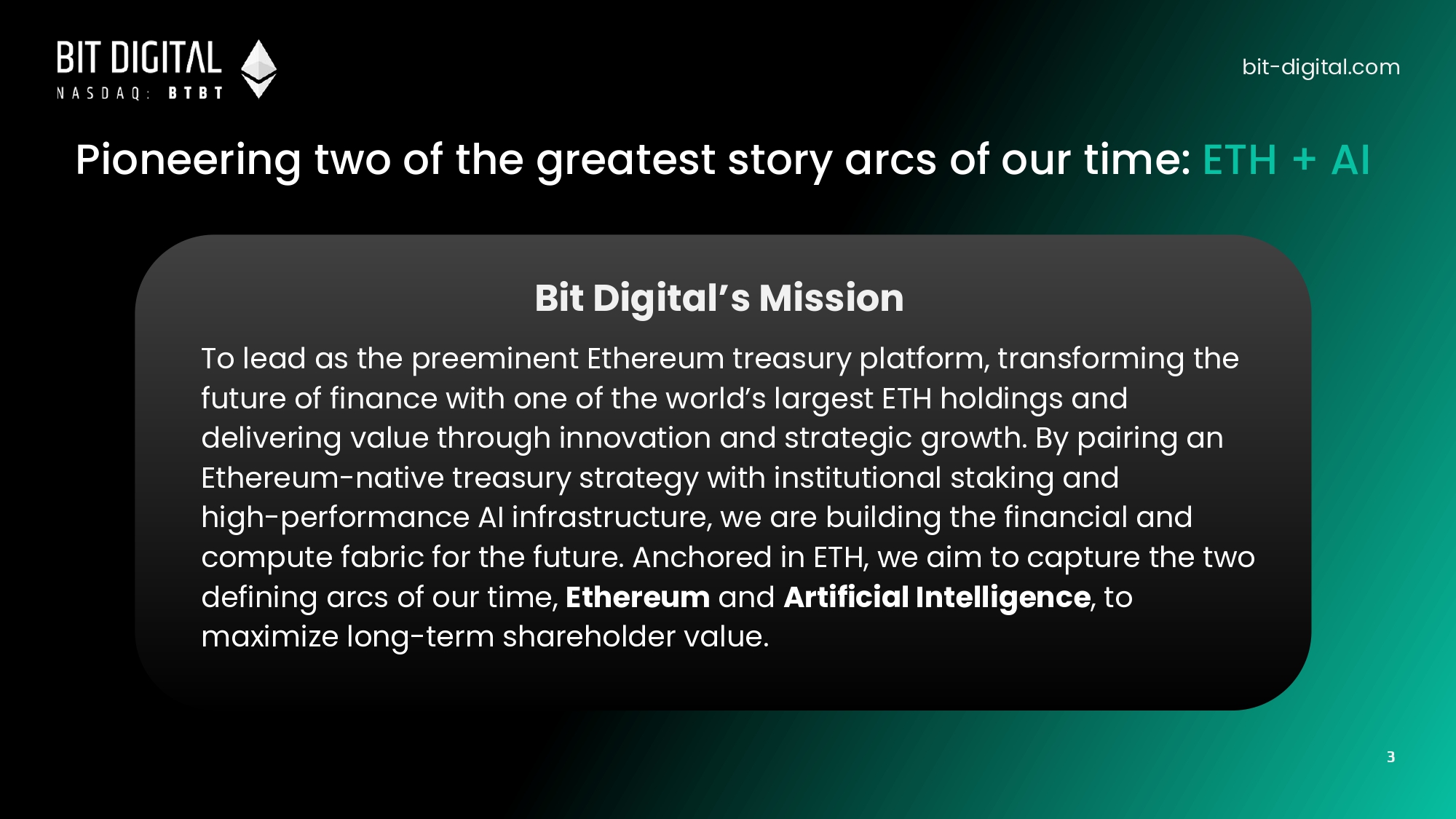 Pioneering two of the greatest story arcs of our time: ETH + AI bit - digital.com Bit Digital’s Mission To lead as the preeminent Ethereum treasury platform, transforming the future of finance with one of the world’s largest ETH holdings and delivering value through innovation and strategic growth. By pairing an Ethereum - native treasury strategy with institutional staking and high - performance AI infrastructure, we are building the financial and compute fabric for the future. Anchored in ETH, we aim to capture the two defining arcs of our time, Ethereum and Artificial Intelligence , to maximize long - term shareholder value. 3