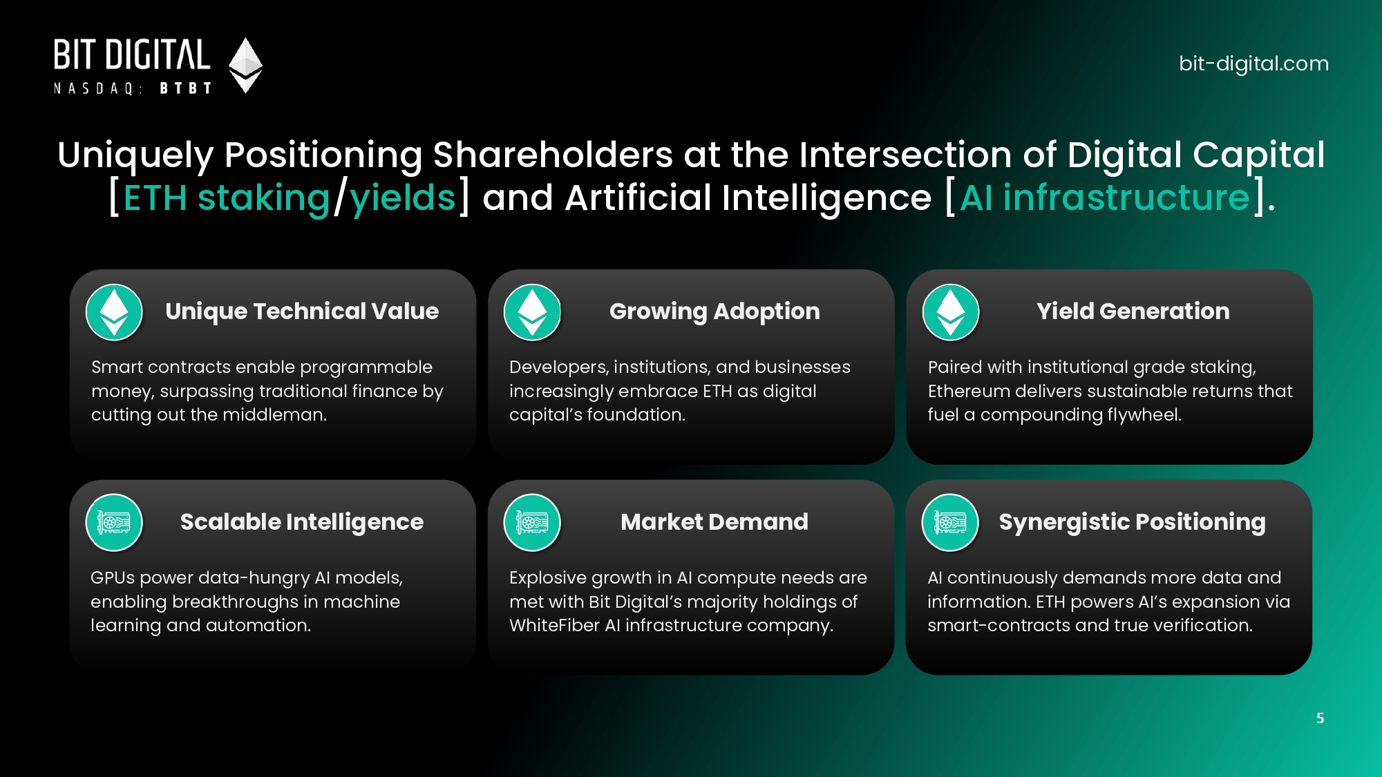 ● Programmable Powerhouse: Ethereum’s smart contracts and DeFi ecosystem are redefining global finance as the foundation of digital capital – while cutting out the traditional middleman. ● Staking Yield Advantage: ETH staking delivers sustainable returns, fueling Bit Digital’s flywheel of growth. ● Powering Intelligence: Our ownership in AI and high - performance computing through our majority holdings of WYFI, a differentiated AI infrastructure company, provides exposure to the significant growth of data - hungry artificial intelligence opportunities. TOGETHER, THEY FORM THE BACKBONE OF THE DIGITAL ECONOMY bit - digital.com Why Ethereum + Artificial Intelligence? 4