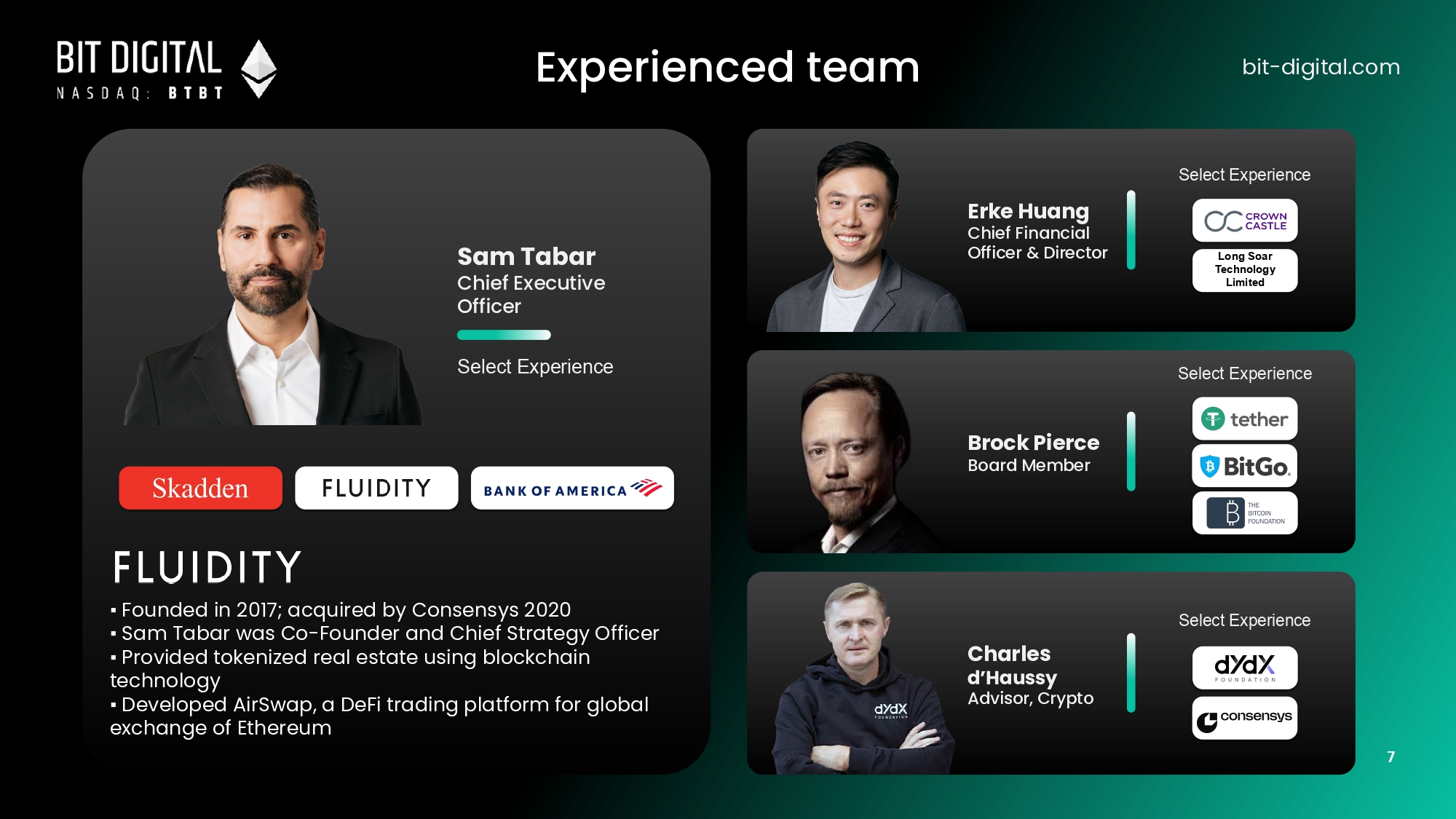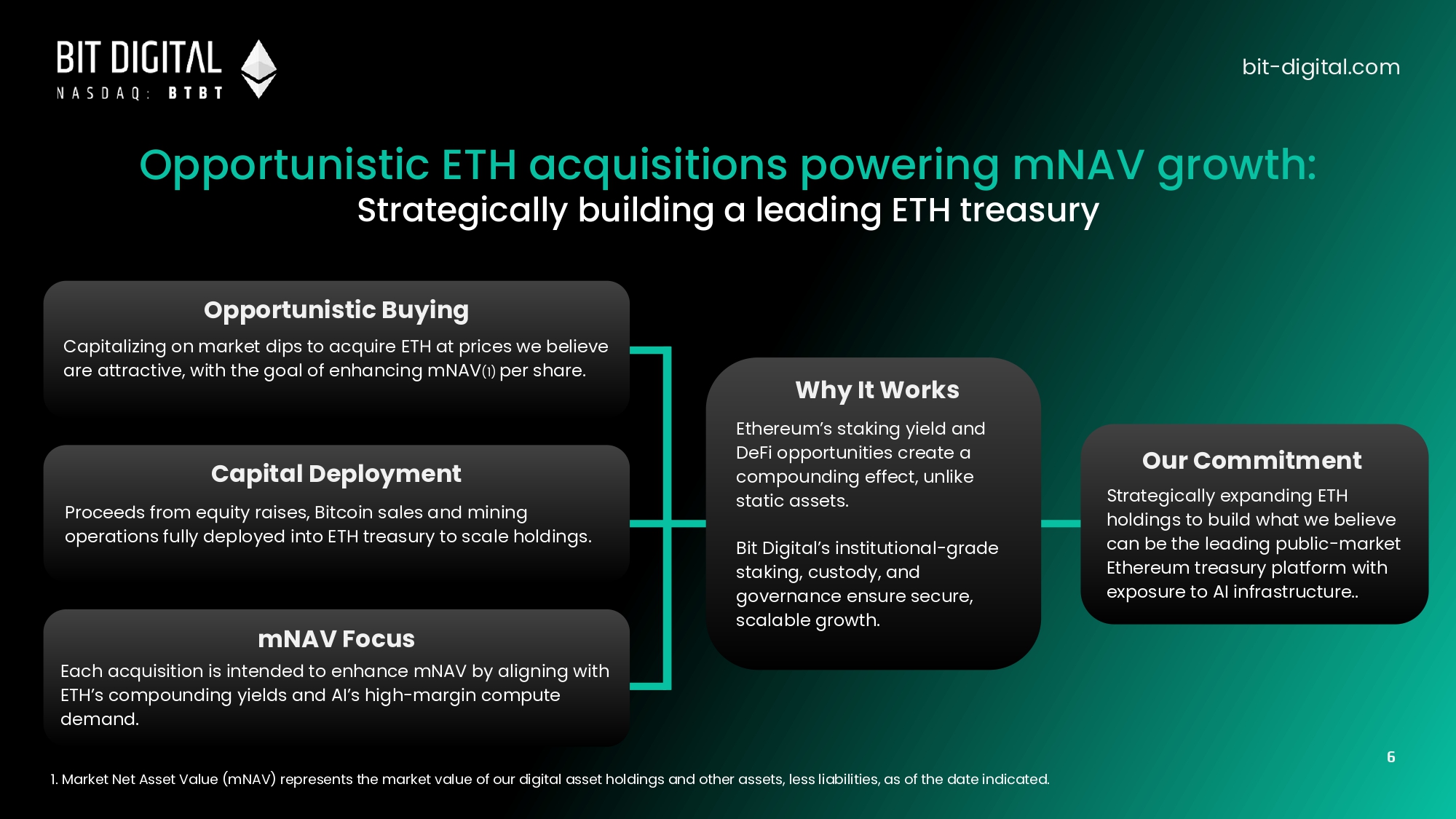 Opportunistic ETH acquisitions powering mNAV growth: Strategically building a leading ETH treasury bit - digital.com Opportunistic Buying Capitalizing on market dips to acquire ETH at prices we believe are attractive, with the goal of enhancing mNAV (1) per share. Capital Deployment Proceeds from equity raises, Bitcoin sales and mining operations fully deployed into ETH treasury to scale holdings. mNAV Focus Each acquisition is intended to enhance mNAV by aligning with ETH’s compounding yields and AI’s high - margin compute demand. Why It Works Ethereum’s staking yield and DeFi opportunities create a compounding effect, unlike static assets. Bit Digital’s institutional - grade staking, custody, and governance ensure secure, scalable growth. Our Commitment Strategically expanding ETH holdings to build what we believe 6 1. Market Net Asset Value (mNAV) represents the market value of our digital asset holdings and other assets, less liabilities, as of the date indicated. can be the leading public - market Ethereum treasury platform with exposure to AI infrastructure..
