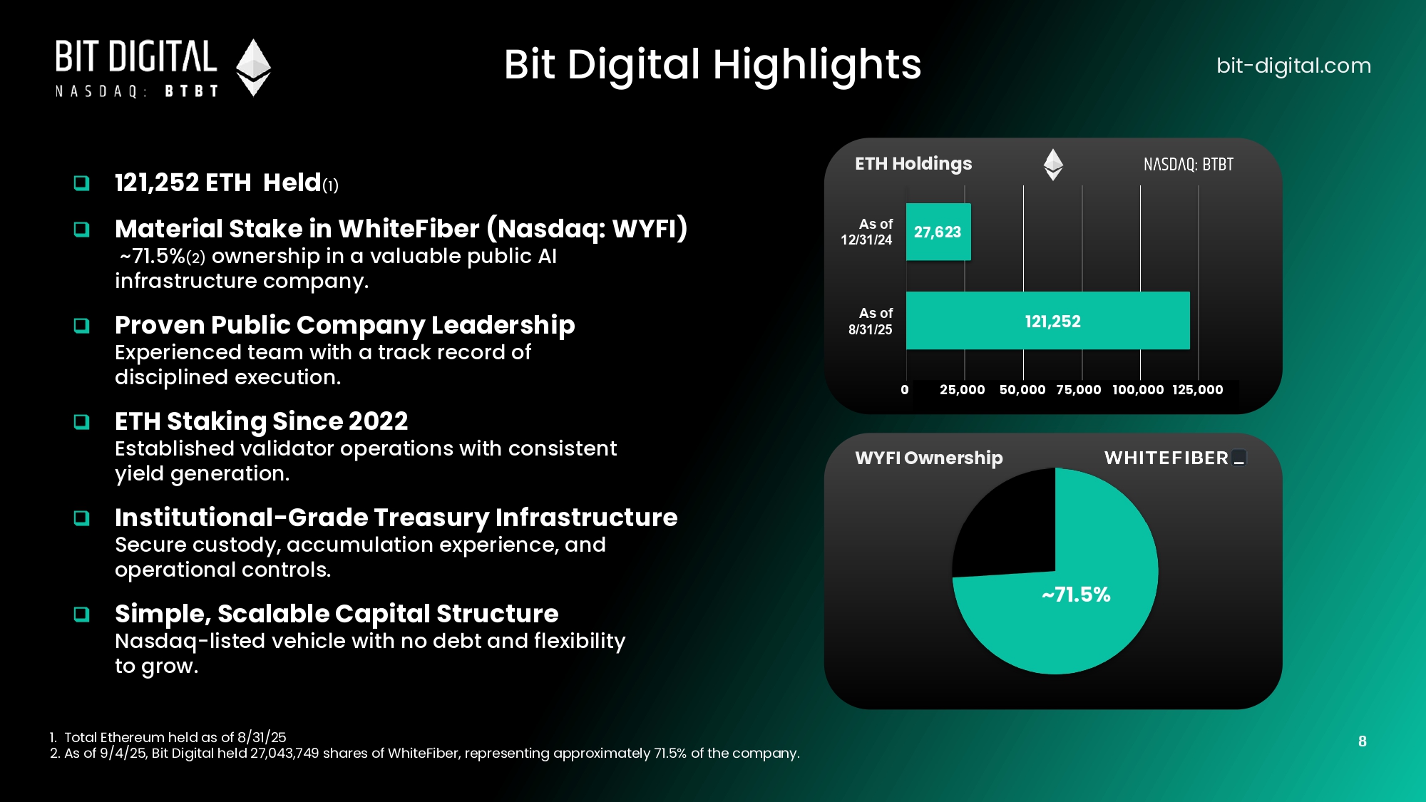 Bit Digital reimagined bit - digital.com 121,252 ETH held ~$532.5MM value As of 8/31/25 Ethereum Holdings 100% ETH Accumulation Strategy Bit Digital owns 11 ~74.3% of WYFI 27,043,749 shares ~$441.9MM value As of 8/31/25