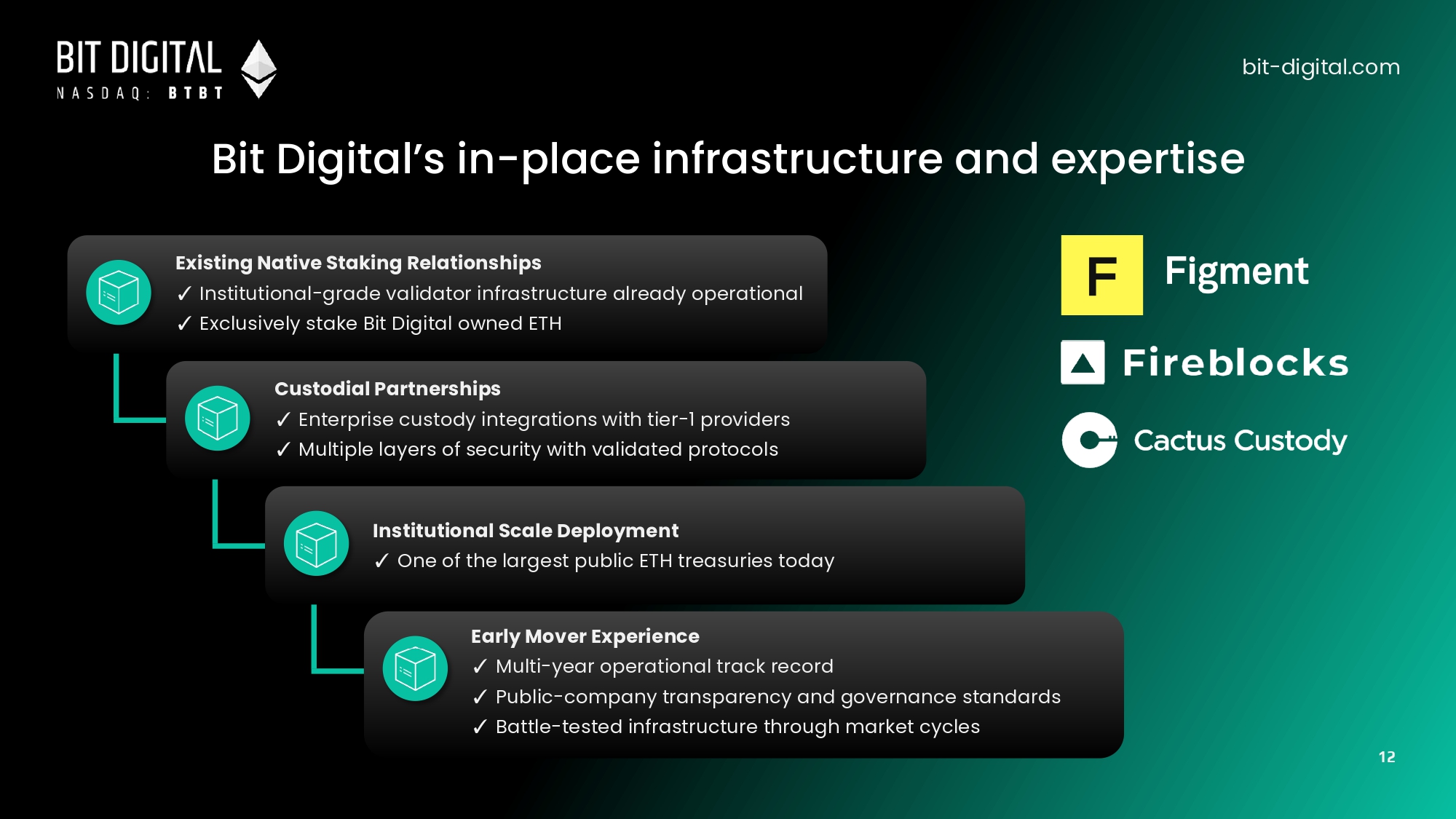 bit - digital.com Bit Digital’s in - place infrastructure and expertise Existing Native Staking Relationships ✓ Institutional - grade validator infrastructure already operational ✓ Exclusively stake Bit Digital owned ETH Custodial Partnerships ✓ Enterprise custody integrations with tier - 1 providers ✓ Multiple layers of security with validated protocols Institutional Scale Deployment ✓ One of the largest public ETH treasuries today Early Mover Experience ✓ Multi - year operational track record ✓ Public - company transparency and governance standards ✓ Battle - tested infrastructure through market cycles 12