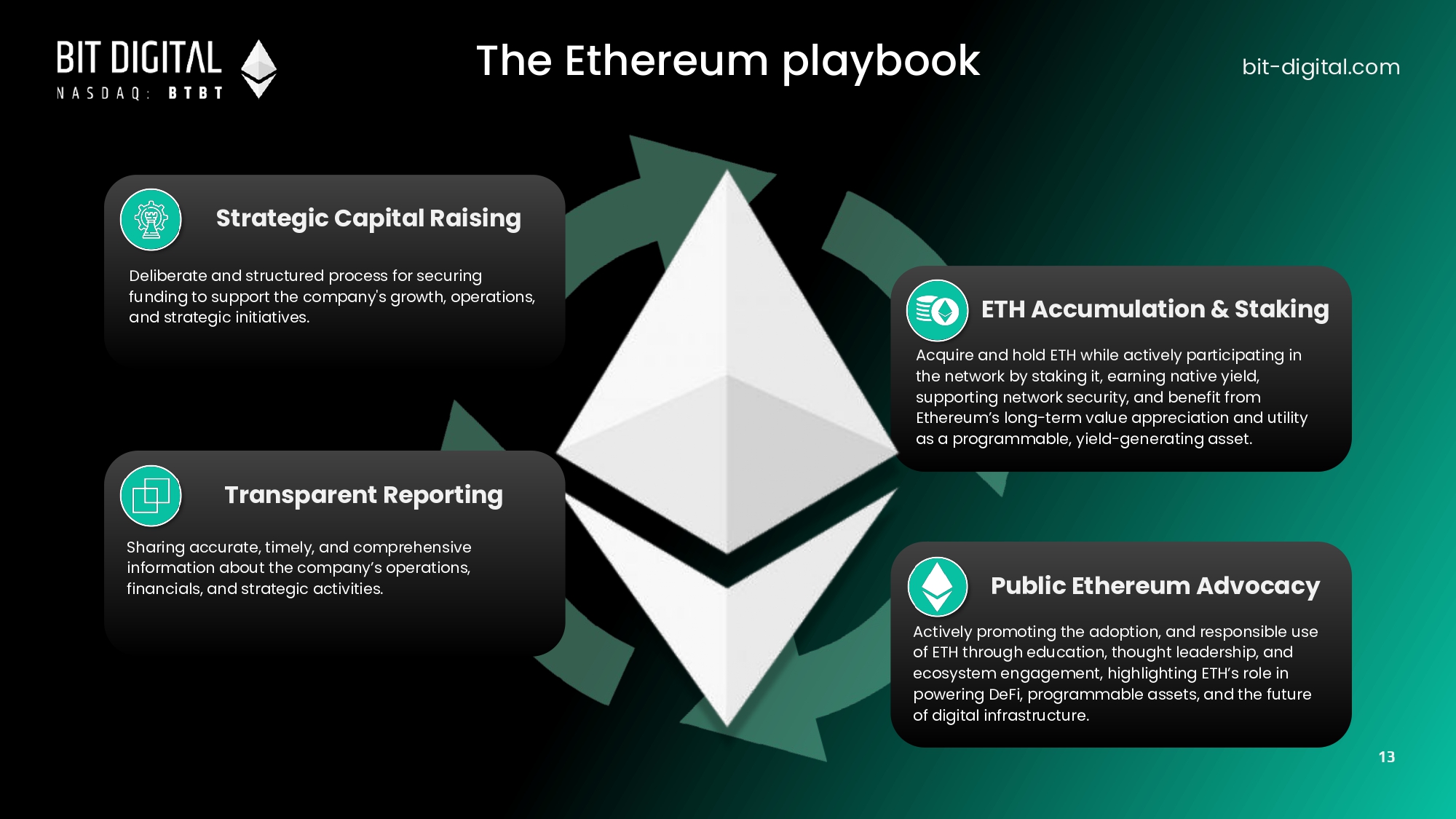 The Ethereum playbook bit - digital.com Strategic Capital Raising Public Ethereum Advocacy Actively promoting the adoption, and responsible use of ETH through education, thought leadership, and ecosystem engagement, highlighting ETH’s role in powering DeFi, programmable assets, and the future of digital infrastructure. ETH Accumulation & Staking Acquire and hold ETH while actively participating in the network by staking it, earning native yield, supporting network security, and benefit from Ethereum’s long - term value appreciation and utility as a programmable, yield - generating asset. Deliberate and structured process for securing funding to support the company's growth, operations, and strategic initiatives. Transparent Reporting Sharing accurate, timely, and comprehensive information about the company’s operations, financials, and strategic activities . 13