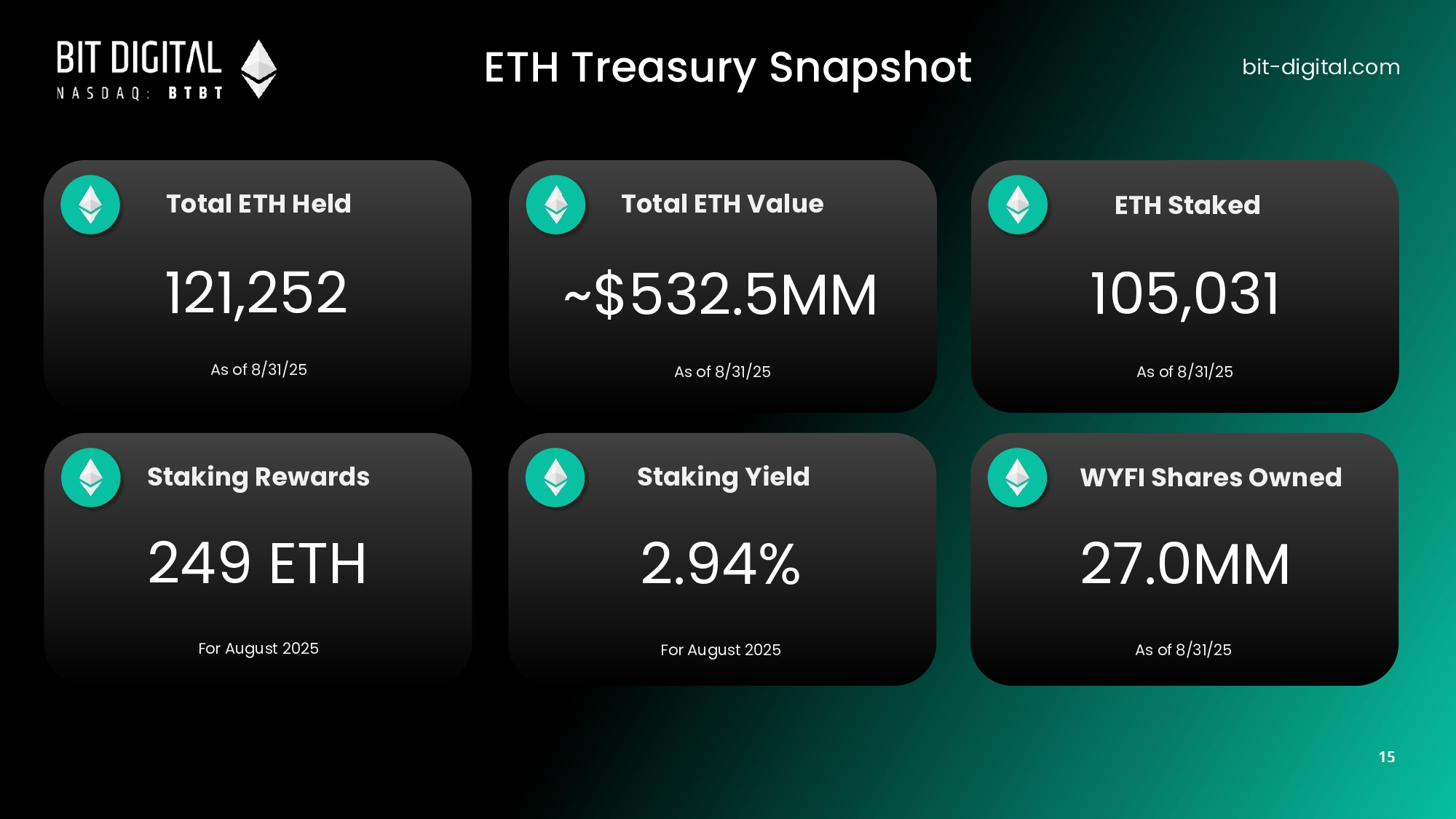 bit - digital.com Total ETH Held Total ETH Value Staking Rewards 249 ETH For August 2025 Staking Yield 2.94% For August 2025 WYFI Shares Owned 27.0MM As of 8/31/25 121,252 As of 8/31/25 ~$532.5MM As of 8/31/25 ETH Staked 105,031 As of 8/31/25 ETH Treasury Snapshot 15