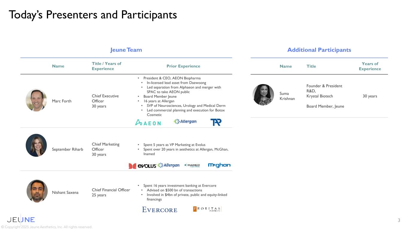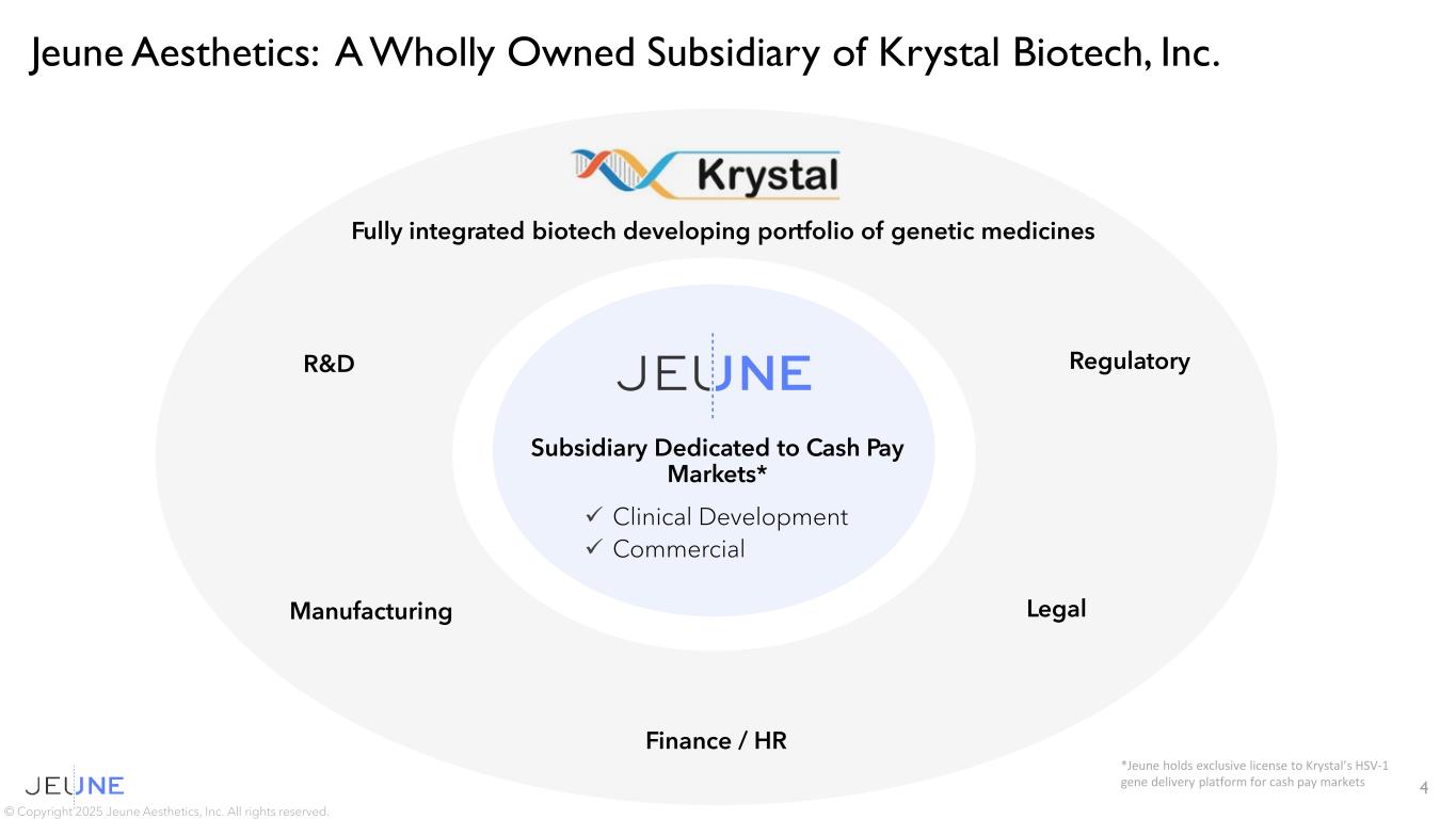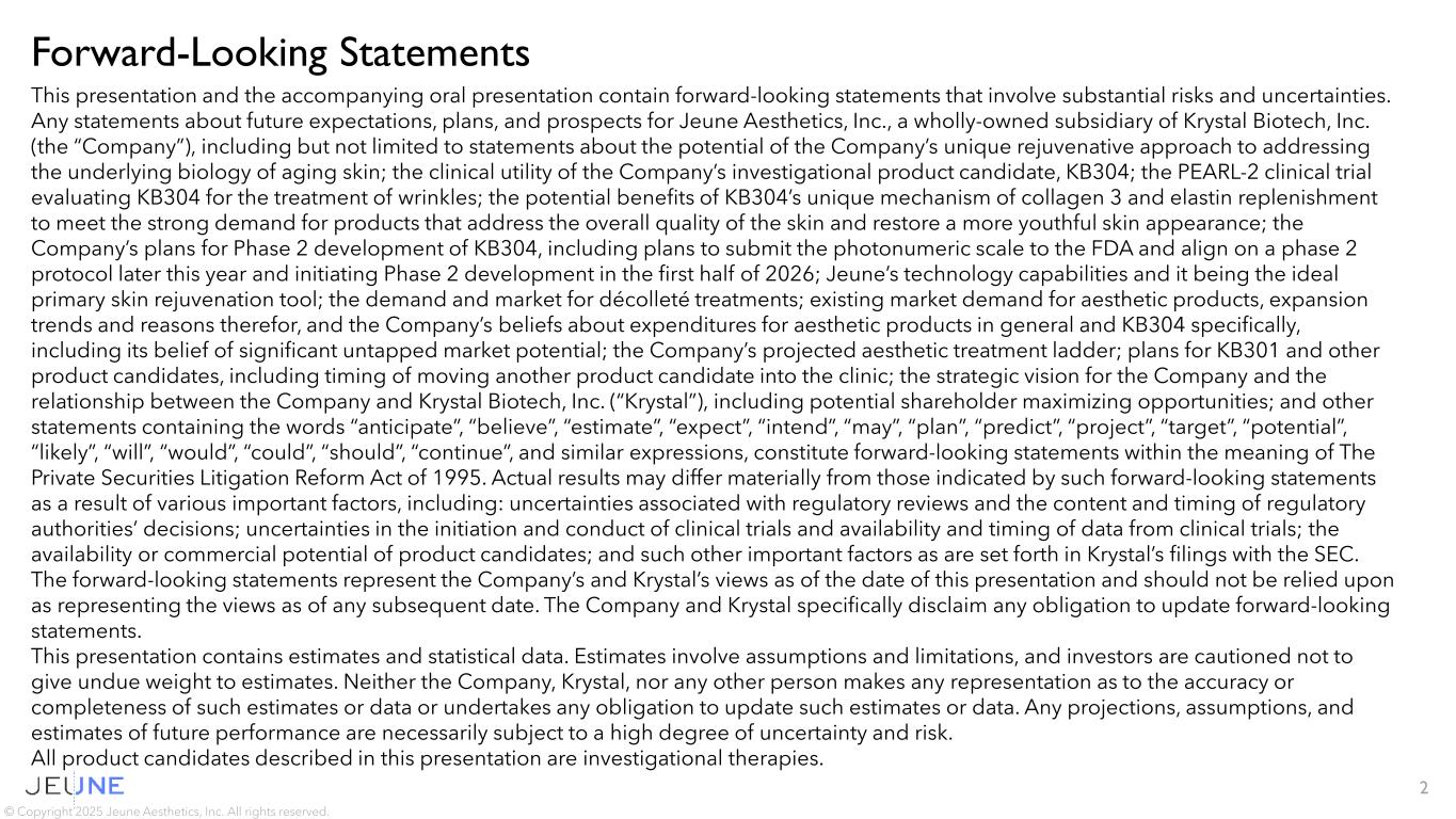 Forward-Looking Statements 2 This presentation and the accompanying oral presentation contain forward-looking statements that involve substantial risks and uncertainties. Any statements about future expectations, plans, and prospects for Jeune Aesthetics, Inc., a wholly-owned subsidiary of Krystal Biotech, Inc. (the “Company”), including but not limited to statements about the potential of the Company’s unique rejuvenative approach to addressing the underlying biology of aging skin; the clinical utility of the Company’s investigational product candidate, KB304; the PEARL-2 clinical trial evaluating KB304 for the treatment of wrinkles; the potential benefits of KB304’s unique mechanism of collagen 3 and elastin replenishment to meet the strong demand for products that address the overall quality of the skin and restore a more youthful skin appearance; the Company’s plans for Phase 2 development of KB304, including plans to submit the photonumeric scale to the FDA and align on a phase 2 protocol later this year and initiating Phase 2 development in the first half of 2026; Jeune’s technology capabilities and it being the ideal primary skin rejuvenation tool; the demand and market for décolleté treatments; existing market demand for aesthetic products, expansion trends and reasons therefor, and the Company’s beliefs about expenditures for aesthetic products in general and KB304 specifically, including its belief of significant untapped market potential; the Company’s projected aesthetic treatment ladder; plans for KB301 and other product candidates, including timing of moving another product candidate into the clinic; the strategic vision for the Company and the relationship between the Company and Krystal Biotech, Inc. (“Krystal”), including potential shareholder maximizing opportunities; and other statements containing the words “anticipate”, “believe”, “estimate”, “expect”, “intend”, “may”, “plan”, “predict”, “project”, “target”, “potential”, “likely”, “will”, “would”, “could”, “should”, “continue”, and similar expressions, constitute forward-looking statements within the meaning of The Private Securities Litigation Reform Act of 1995. Actual results may differ materially from those indicated by such forward-looking statements as a result of various important factors, including: uncertainties associated with regulatory reviews and the content and timing of regulatory authorities’ decisions; uncertainties in the initiation and conduct of clinical trials and availability and timing of data from clinical trials; the availability or commercial potential of product candidates; and such other important factors as are set forth in Krystal’s filings with the SEC. The forward-looking statements represent the Company’s and Krystal’s views as of the date of this presentation and should not be relied upon as representing the views as of any subsequent date. The Company and Krystal specifically disclaim any obligation to update forward-looking statements. This presentation contains estimates and statistical data. Estimates involve assumptions and limitations, and investors are cautioned not to give undue weight to estimates. Neither the Company, Krystal, nor any other person makes any representation as to the accuracy or completeness of such estimates or data or undertakes any obligation to update such estimates or data. Any projections, assumptions, and estimates of future performance are necessarily subject to a high degree of uncertainty and risk. All product candidates described in this presentation are investigational therapies. © Copyright 2025 Jeune Aesthetics, Inc. All rights reserved.