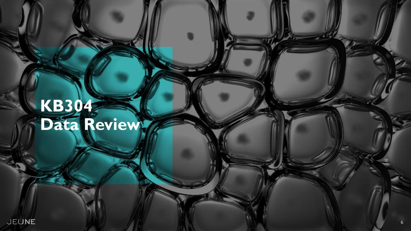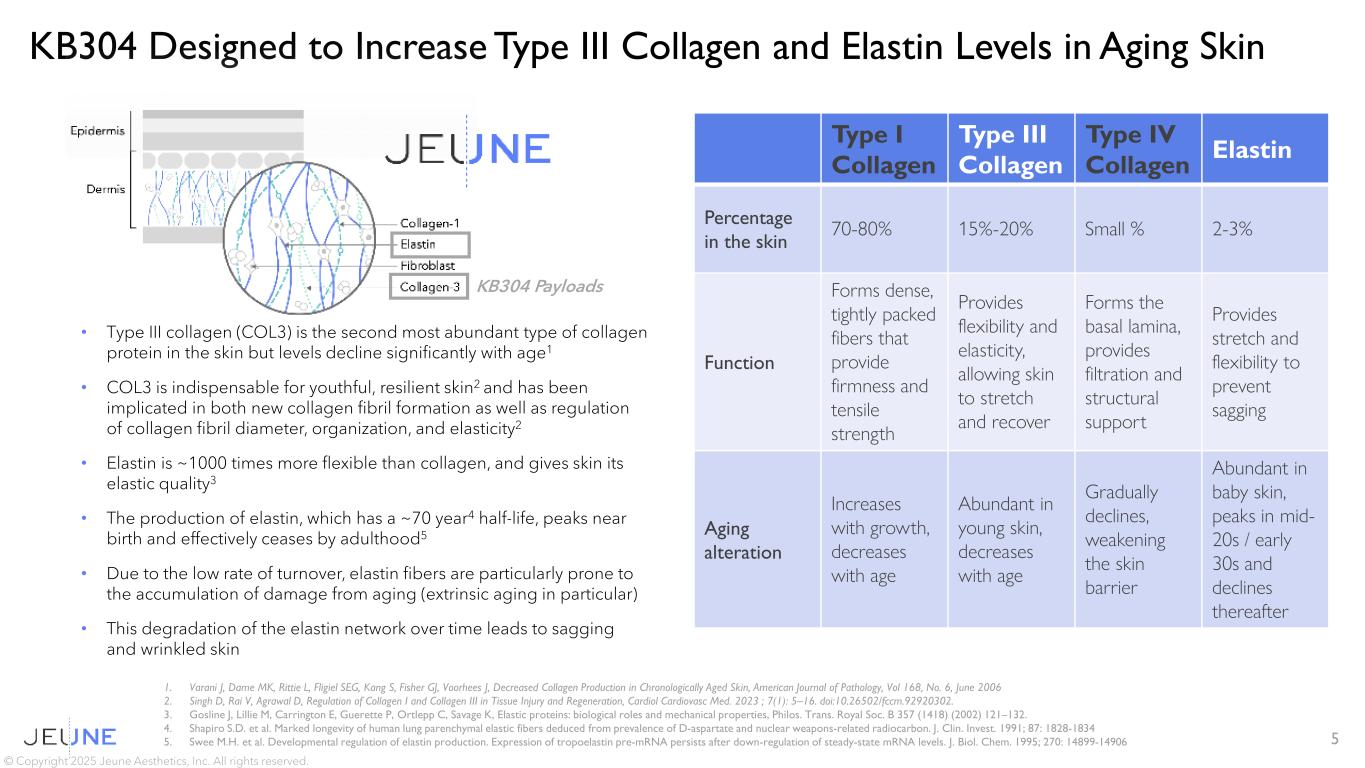 KB304 Designed to Increase Type III Collagen and Elastin Levels in Aging Skin 5 © Copyright 2025 Jeune Aesthetics, Inc. All rights reserved. KB304 Payloads Type I Collagen Type III Collagen Type IV Collagen Elastin Percentage in the skin 70-80% 15%-20% Small % 2-3% Function Forms dense, tightly packed fibers that provide firmness and tensile strength Provides flexibility and elasticity, allowing skin to stretch and recover Forms the basal lamina, provides filtration and structural support Provides stretch and flexibility to prevent sagging Aging alteration Increases with growth, decreases with age Abundant in young skin, decreases with age Gradually declines, weakening the skin barrier Abundant in baby skin, peaks in mid- 20s / early 30s and declines thereafter • Type III collagen (COL3) is the second most abundant type of collagen protein in the skin but levels decline significantly with age1 • COL3 is indispensable for youthful, resilient skin2 and has been implicated in both new collagen fibril formation as well as regulation of collagen fibril diameter, organization, and elasticity2 • Elastin is ~1000 times more flexible than collagen, and gives skin its elastic quality3 • The production of elastin, which has a ~70 year4 half-life, peaks near birth and effectively ceases by adulthood5 • Due to the low rate of turnover, elastin fibers are particularly prone to the accumulation of damage from aging (extrinsic aging in particular) • This degradation of the elastin network over time leads to sagging and wrinkled skin 1. Varani J, Dame MK, Rittie L, Fligiel SEG, Kang S, Fisher GJ, Voorhees J, Decreased Collagen Production in Chronologically Aged Skin, American Journal of Pathology, Vol 168, No. 6, June 2006 2. Singh D, Rai V, Agrawal D, Regulation of Collagen I and Collagen III in Tissue Injury and Regeneration, Cardiol Cardiovasc Med. 2023 ; 7(1): 5–16. doi:10.26502/fccm.92920302. 3. Gosline J, Lillie M, Carrington E, Guerette P, Ortlepp C, Savage K, Elastic proteins: biological roles and mechanical properties, Philos. Trans. Royal Soc. B 357 (1418) (2002) 121–132. 4. Shapiro S.D. et al. Marked longevity of human lung parenchymal elastic fibers deduced from prevalence of D-aspartate and nuclear weapons-related radiocarbon. J. Clin. Invest. 1991; 87: 1828-1834 5. Swee M.H. et al. Developmental regulation of elastin production. Expression of tropoelastin pre-mRNA persists after down-regulation of steady-state mRNA levels. J. Biol. Chem. 1995; 270: 14899-14906