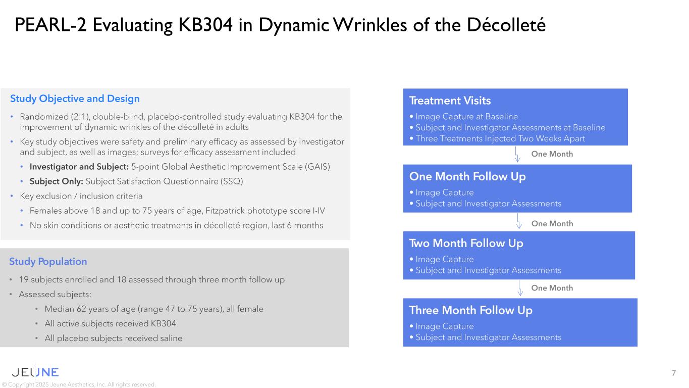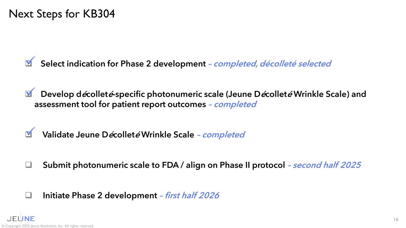 Next Steps for KB304 16 © Copyright 2025 Jeune Aesthetics, Inc. All rights reserved.  Select indication for Phase 2 development – completed, décolleté selected  Develop décolleté-specific photonumeric scale (Jeune Décolleté Wrinkle Scale) and assessment tool for patient report outcomes – completed  Validate Jeune Décolleté Wrinkle Scale – completed  Submit photonumeric scale to FDA / align on Phase II protocol – second half 2025  Initiate Phase 2 development – first half 2026   