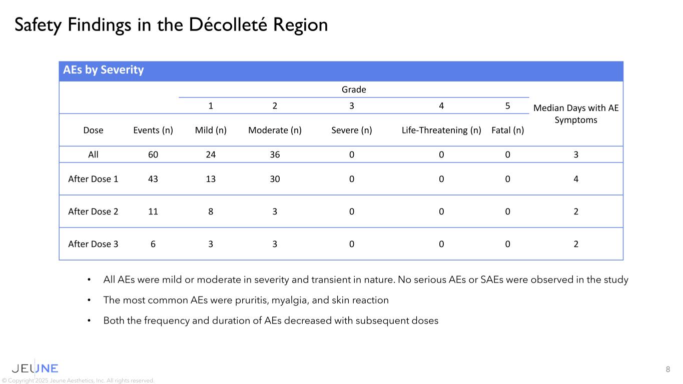 7 © Copyright 2025 Jeune Aesthetics, Inc. All rights reserved. PEARL-2 Evaluating KB304 in Dynamic Wrinkles of the Décolleté Study Objective and Design • Randomized (2:1), double-blind, placebo-controlled study evaluating KB304 for the improvement of dynamic wrinkles of the décolleté in adults • Key study objectives were safety and preliminary efficacy as assessed by investigator and subject, as well as images; surveys for efficacy assessment included • Investigator and Subject: 5-point Global Aesthetic Improvement Scale (GAIS) • Subject Only: Subject Satisfaction Questionnaire (SSQ) • Key exclusion / inclusion criteria • Females above 18 and up to 75 years of age, Fitzpatrick phototype score I-IV • No skin conditions or aesthetic treatments in décolleté region, last 6 months Study Population • 19 subjects enrolled and 18 assessed through three month follow up • Assessed subjects: • Median 62 years of age (range 47 to 75 years), all female • All active subjects received KB304 • All placebo subjects received saline Treatment Visits • Image Capture at Baseline • Subject and Investigator Assessments at Baseline • Three Treatments Injected Two Weeks Apart One Month Follow Up • Image Capture • Subject and Investigator Assessments Two Month Follow Up • Image Capture • Subject and Investigator Assessments Three Month Follow Up • Image Capture • Subject and Investigator Assessments One Month One Month One Month