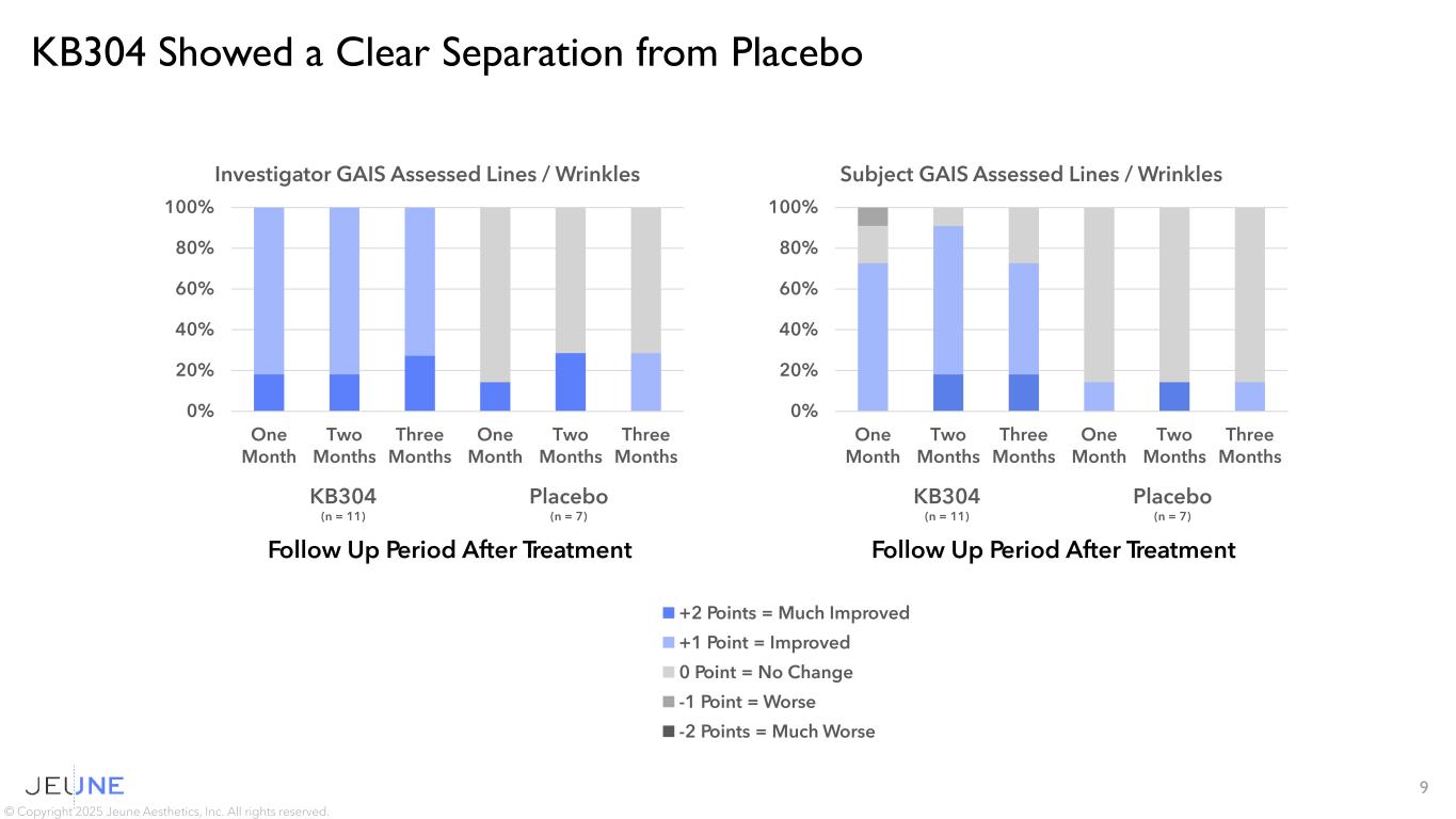 Safety Findings in the Décolleté Region • All AEs were mild or moderate in severity and transient in nature. No serious AEs or SAEs were observed in the study • The most common AEs were pruritis, myalgia, and skin reaction • Both the frequency and duration of AEs decreased with subsequent doses © Copyright 2025 Jeune Aesthetics, Inc. All rights reserved. 8 AEs by Severity Grade Median Days with AE Symptoms 1 2 3 4 5 Dose Events (n) Mild (n) Moderate (n) Severe (n) Life-Threatening (n) Fatal (n) All 60 24 36 0 0 0 3 After Dose 1 43 13 30 0 0 0 4 After Dose 2 11 8 3 0 0 0 2 After Dose 3 6 3 3 0 0 0 2