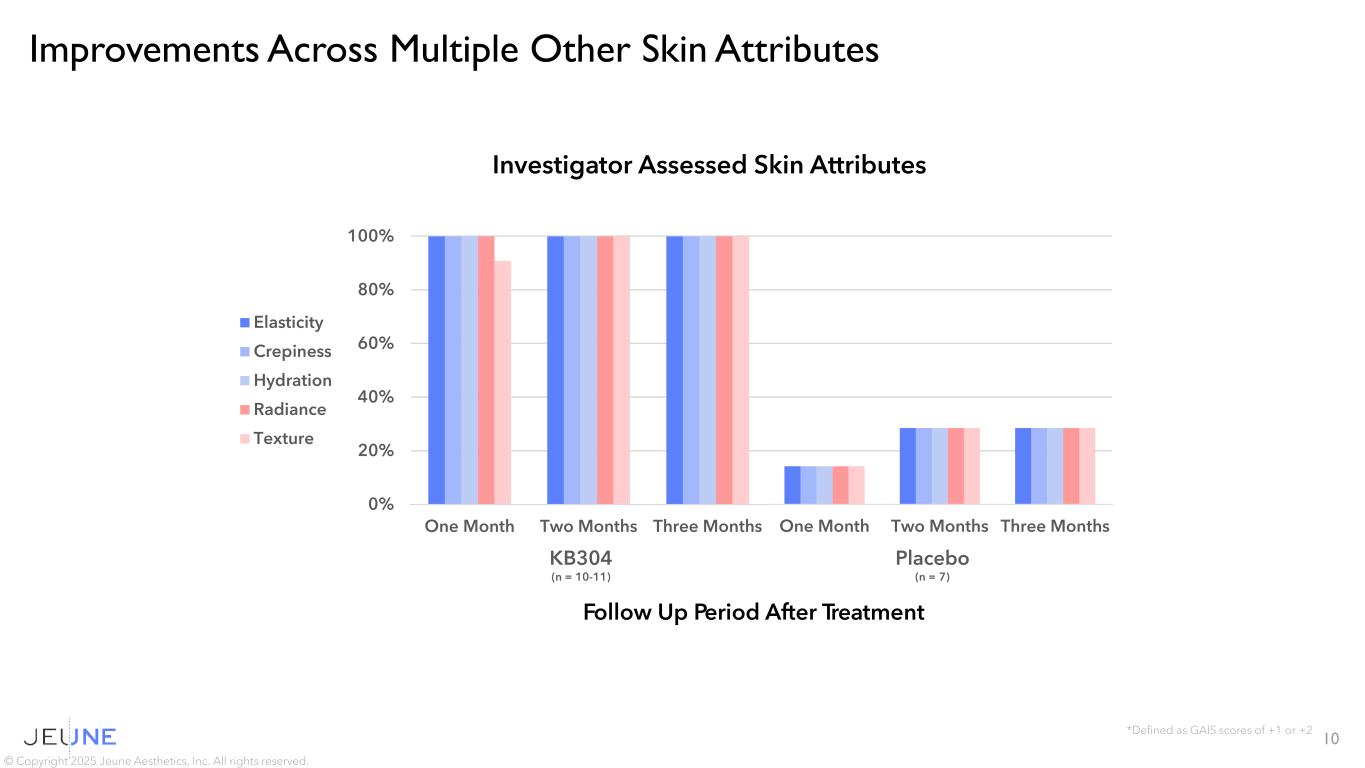 9 © Copyright 2025 Jeune Aesthetics, Inc. All rights reserved. KB304 Showed a Clear Separation from Placebo Follow Up Period After Treatment KB304 (n = 11) Placebo (n = 7) 0% 20% 40% 60% 80% 100% One Month Two Months Three Months One Month Two Months Three Months Investigator GAIS Assessed Lines / Wrinkles 0% 20% 40% 60% 80% 100% One Month Two Months Three Months One Month Two Months Three Months Subject GAIS Assessed Lines / Wrinkles Follow Up Period After Treatment KB304 (n = 11) Placebo (n = 7) +2 Points = Much Improved +1 Point = Improved 0 Point = No Change -1 Point = Worse -2 Points = Much Worse