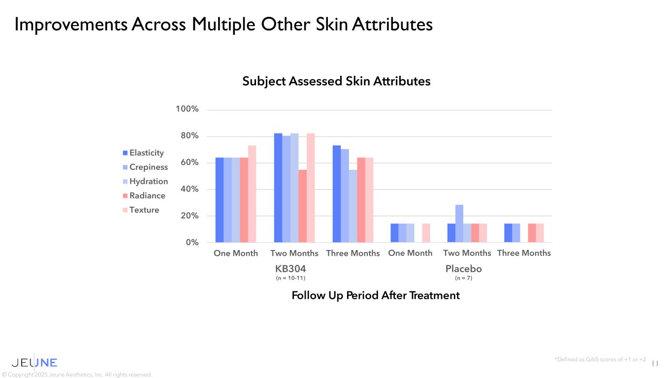 10 © Copyright 2025 Jeune Aesthetics, Inc. All rights reserved. Improvements Across Multiple Other Skin Attributes *Defined as GAIS scores of +1 or +2 Investigator Assessed Skin Attributes Follow Up Period After Treatment One Month Two Months Three Months 0% 20% 40% 60% 80% 100% One Month Two Months Three Months Elasticity Crepiness Hydration Radiance Texture KB304 (n = 10-11) Placebo (n = 7)