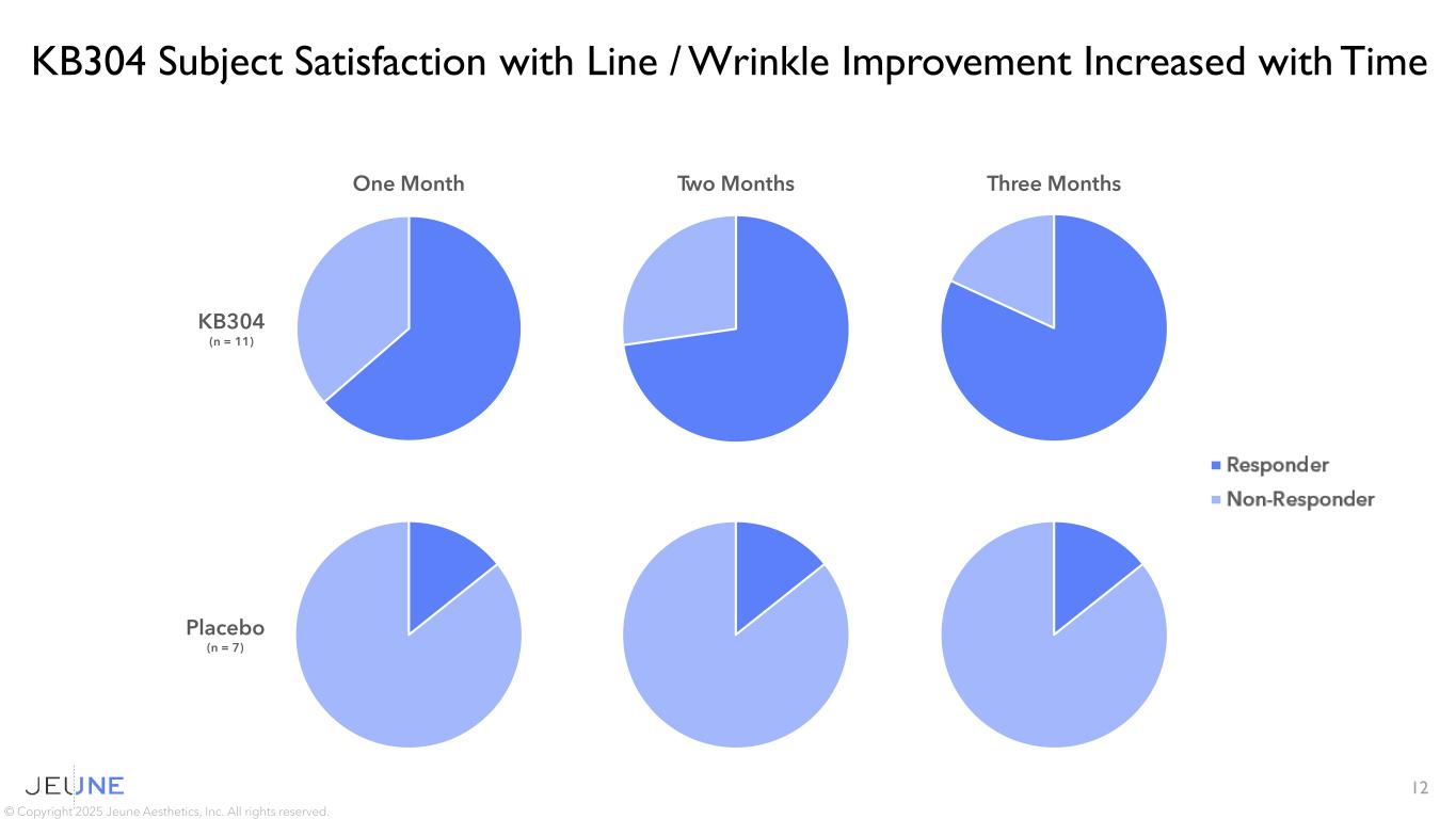 11 © Copyright 2025 Jeune Aesthetics, Inc. All rights reserved. Improvements Across Multiple Other Skin Attributes *Defined as GAIS scores of +1 or +2 Subject Assessed Skin Attributes Follow Up Period After Treatment KB304 (n = 10-11) Placebo (n = 7) 0% 20% 40% 60% 80% 100% One Month Two Months Three Months Elasticity Crepiness Hydration Radiance Texture One Month Two Months Three Months