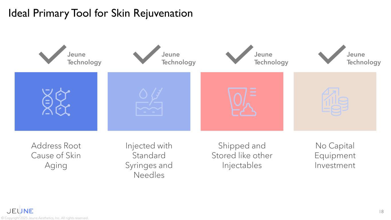 17 Damage FillParalyze Replenish & Restore Using light and sound waves, energy-based devices damage the skin with the hope of triggering a wound healing response Whether hyaluronic acid, bovine collagen, or others, fillers add artificial volume to temporarily decrease the appearance of wrinkles By inducing denervation toxins paralyze the underlying muscle to prevent movement, thereby temporarily decreasing the appearance of wrinkles Via targeted delivery directly to skin cells Jeune’s treatments are designed to replenish key skin proteins to restore and maintain healthy, glowing skin Neurotoxins Fillers Energy-Based Devices Jeune vs. Jeune is focused on Addressing the Underlying Cause of Skin Aging No Primary Aesthetic Tool Addresses Aged Skin © Copyright 2025 Jeune Aesthetics, Inc. All rights reserved.