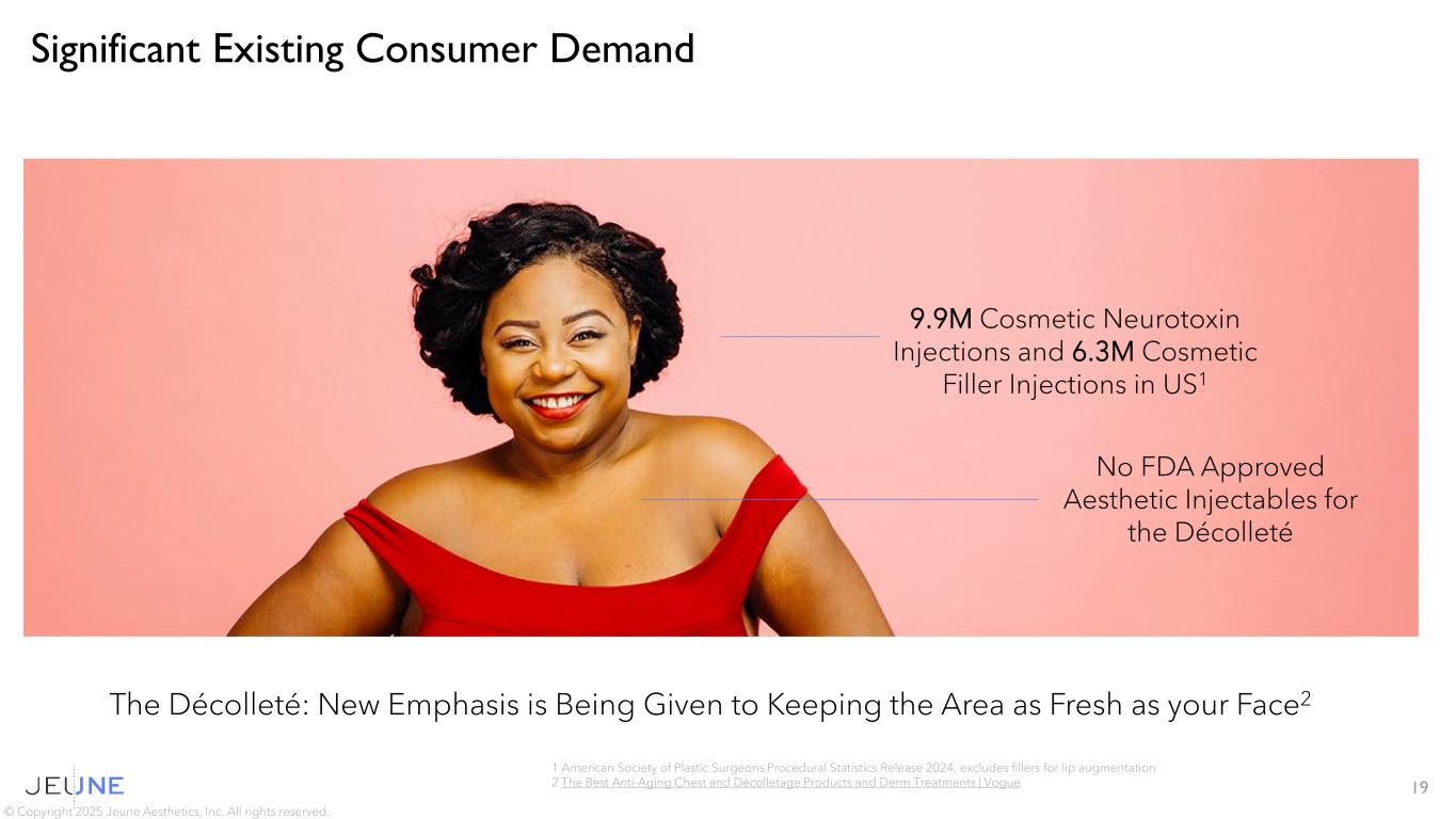 Address Root Cause of Skin Aging Injected with Standard Syringes and Needles Shipped and Stored like other Injectables No Capital Equipment Investment Jeune Technology Jeune Technology Jeune Technology Jeune Technology © Copyright 2025 Jeune Aesthetics, Inc. All rights reserved. 18 Ideal Primary Tool for Skin Rejuvenation