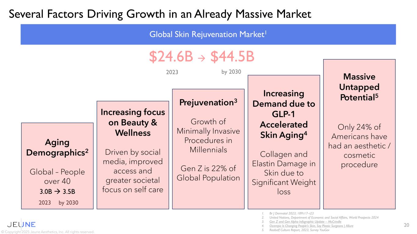 9.9M Cosmetic Neurotoxin Injections and 6.3M Cosmetic Filler Injections in US1 No FDA Approved Aesthetic Injectables for the Décolleté © Copyright 2025 Jeune Aesthetics, Inc. All rights reserved. 1 American Society of Plastic Surgeons Procedural Statistics Release 2024, excludes fillers for lip augmentation 2 The Best Anti-Aging Chest and Décolletage Products and Derm Treatments | Vogue The Décolleté: New Emphasis is Being Given to Keeping the Area as Fresh as your Face2 19 Significant Existing Consumer Demand