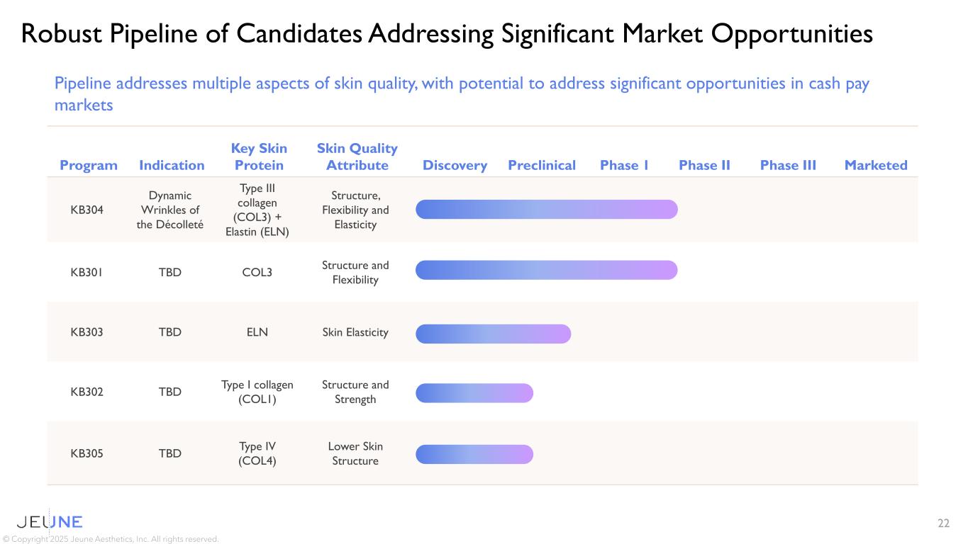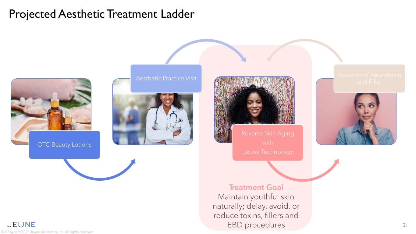 1. Br J Dermatol 2023; 189:i17–i23 2. United Nations, Department of Economic and Social Affairs, World Prospects 2024 3. Gen Z and Gen Alpha Infographic Update – McCrindle 4. Ozempic Is Changing People’s Skin, Say Plastic Surgeons | Allure 5. Realself Culture Report, 2023, Survey YouGov 20 Global Skin Rejuvenation Market1 $24.6B  $44.5B 2023 by 2030 2023 by 2030 Aging Demographics2 Global – People over 40 3.0B  3.5B Increasing focus on Beauty & Wellness Driven by social media, improved access and greater societal focus on self care Prejuvenation3 Growth of Minimally Invasive Procedures in Millennials Gen Z is 22% of Global Population Increasing Demand due to GLP-1 Accelerated Skin Aging4 Collagen and Elastin Damage in Skin due to Significant Weight loss Massive Untapped Potential5 Only 24% of Americans have had an aesthetic / cosmetic procedure Several Factors Driving Growth in an Already Massive Market © Copyright 2025 Jeune Aesthetics, Inc. All rights reserved.