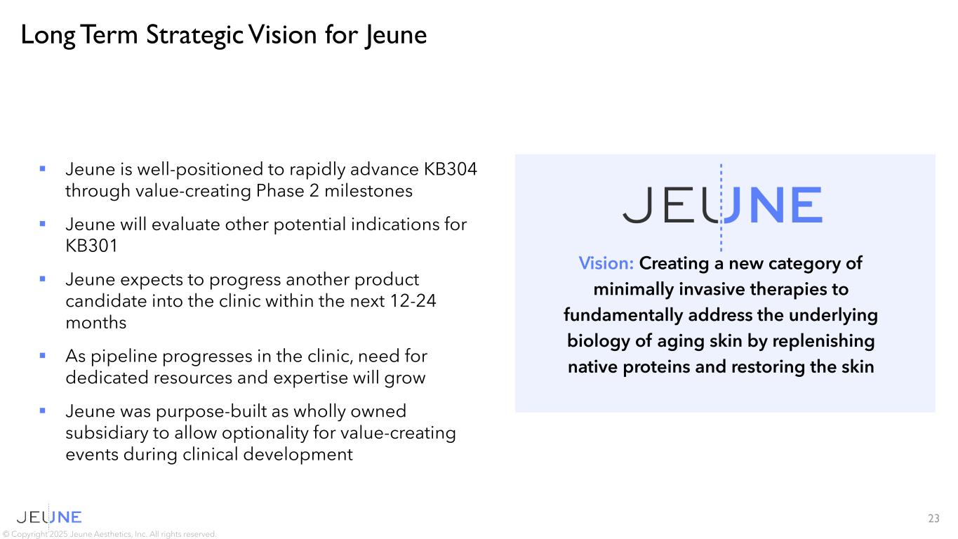 22 Program Indication Key Skin Protein Skin Quality Attribute Discovery Preclinical Phase 1 Phase II Phase III Marketed KB304 Dynamic Wrinkles of the Décolleté Type III collagen (COL3) + Elastin (ELN) Structure, Flexibility and Elasticity KB301 TBD COL3 Structure and Flexibility KB303 TBD ELN Skin Elasticity KB302 TBD Type I collagen (COL1) Structure and Strength KB305 TBD Type IV (COL4) Lower Skin Structure Pipeline addresses multiple aspects of skin quality, with potential to address significant opportunities in cash pay markets Robust Pipeline of Candidates Addressing Significant Market Opportunities © Copyright 2025 Jeune Aesthetics, Inc. All rights reserved.