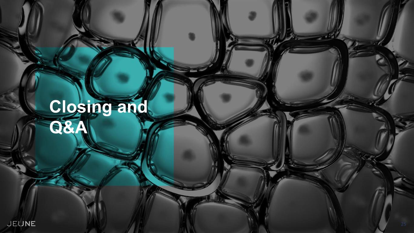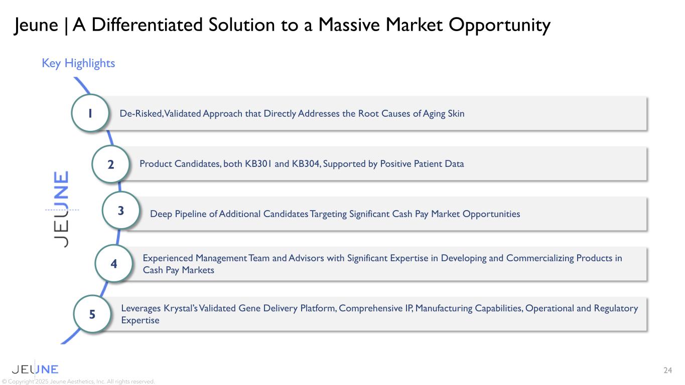23 Long Term Strategic Vision for Jeune Vision: Creating a new category of minimally invasive therapies to fundamentally address the underlying biology of aging skin by replenishing native proteins and restoring the skin  Jeune is well-positioned to rapidly advance KB304 through value-creating Phase 2 milestones  Jeune will evaluate other potential indications for KB301  Jeune expects to progress another product candidate into the clinic within the next 12-24 months  As pipeline progresses in the clinic, need for dedicated resources and expertise will grow  Jeune was purpose-built as wholly owned subsidiary to allow optionality for value-creating events during clinical development © Copyright 2025 Jeune Aesthetics, Inc. All rights reserved.