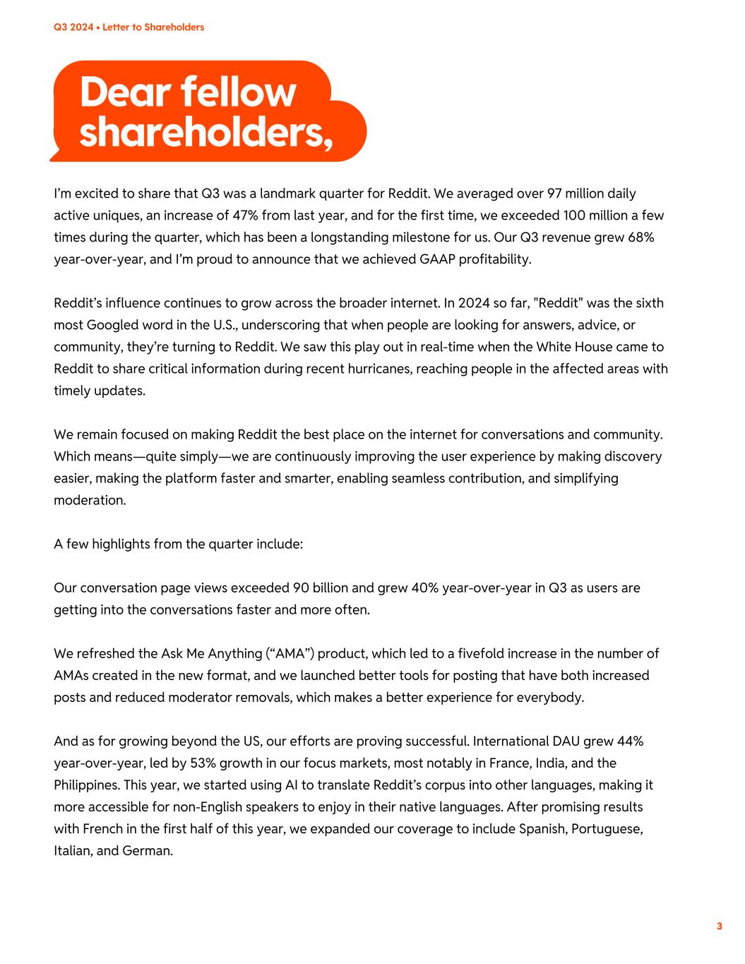 Dear fellow shareholders, I’m excited to share that Q3 was a landmark quarter for Reddit. We averaged over 97 million daily active uniques, an increase of 47% from last year, and for the first time, we exceeded 100 million a few times during the quarter, which has been a longstanding milestone for us. Our Q3 revenue grew 68% year-over-year, and I’m proud to announce that we achieved GAAP profitability. Reddit’s influence continues to grow across the broader internet. In 2024 so far, "Reddit" was the sixth most Googled word in the U.S., underscoring that when people are looking for answers, advice, or community, they’re turning to Reddit. We saw this play out in real-time when the White House came to Reddit to share critical information during recent hurricanes, reaching people in the affected areas with timely updates. We remain focused on making Reddit the best place on the internet for conversations and community. Which means—quite simply—we are continuously improving the user experience by making discovery easier, making the platform faster and smarter, enabling seamless contribution, and simplifying moderation. A few highlights from the quarter include: Our conversation page views exceeded 90 billion and grew 40% year-over-year in Q3 as users are getting into the conversations faster and more often. We refreshed the Ask Me Anything (“AMA”) product, which led to a fivefold increase in the number of AMAs created in the new format, and we launched better tools for posting that have both increased posts and reduced moderator removals, which makes a better experience for everybody. And as for growing beyond the US, our efforts are proving successful. International DAU grew 44% year-over-year, led by 53% growth in our focus markets, most notably in France, India, and the Philippines. This year, we started using AI to translate Reddit’s corpus into other languages, making it more accessible for non-English speakers to enjoy in their native languages. After promising results with French in the first half of this year, we expanded our coverage to include Spanish, Portuguese, Italian, and German. Q3 2024 • Letter to Shareholders 3