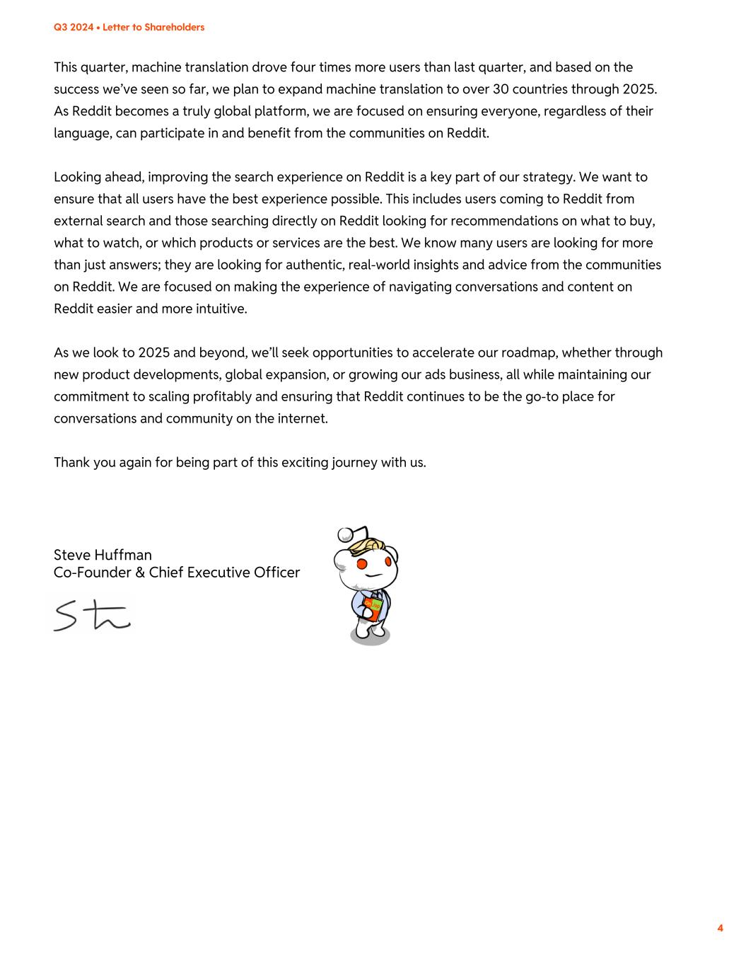 This quarter, machine translation drove four times more users than last quarter, and based on the success we’ve seen so far, we plan to expand machine translation to over 30 countries through 2025. As Reddit becomes a truly global platform, we are focused on ensuring everyone, regardless of their language, can participate in and benefit from the communities on Reddit. Looking ahead, improving the search experience on Reddit is a key part of our strategy. We want to ensure that all users have the best experience possible. This includes users coming to Reddit from external search and those searching directly on Reddit looking for recommendations on what to buy, what to watch, or which products or services are the best. We know many users are looking for more than just answers; they are looking for authentic, real-world insights and advice from the communities on Reddit. We are focused on making the experience of navigating conversations and content on Reddit easier and more intuitive. As we look to 2025 and beyond, we’ll seek opportunities to accelerate our roadmap, whether through new product developments, global expansion, or growing our ads business, all while maintaining our commitment to scaling profitably and ensuring that Reddit continues to be the go-to place for conversations and community on the internet. Thank you again for being part of this exciting journey with us. Steve Huffman Co-Founder & Chief Executive Officer Q3 2024 • Letter to Shareholders 4