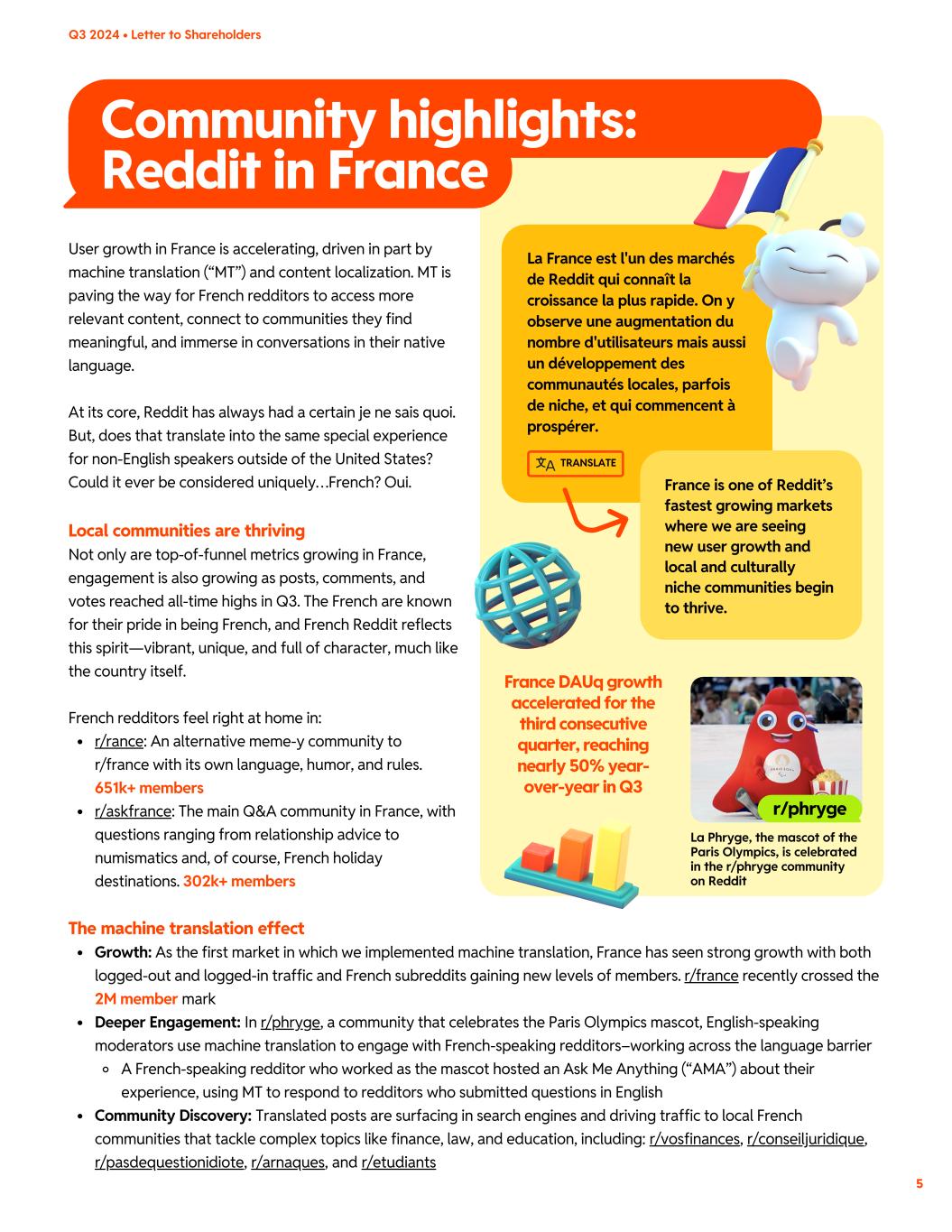 Community highlights: Reddit in France r/phryge TRANSLATE La France est l'un des marchés de Reddit qui connaît la croissance la plus rapide. On y observe une augmentation du nombre d'utilisateurs mais aussi un développement des communautés locales, parfois de niche, et qui commencent à prospérer. France is one of Reddit’s fastest growing markets where we are seeing new user growth and local and culturally niche communities begin to thrive. User growth in France is accelerating, driven in part by machine translation (“MT”) and content localization. MT is paving the way for French redditors to access more relevant content, connect to communities they find meaningful, and immerse in conversations in their native language. At its core, Reddit has always had a certain je ne sais quoi. But, does that translate into the same special experience for non-English speakers outside of the United States? Could it ever be considered uniquely…French? Oui. Local communities are thriving Not only are top-of-funnel metrics growing in France, engagement is also growing as posts, comments, and votes reached all-time highs in Q3. The French are known for their pride in being French, and French Reddit reflects this spirit—vibrant, unique, and full of character, much like the country itself. French redditors feel right at home in: r/rance: An alternative meme-y community to r/france with its own language, humor, and rules. 651k+ members r/askfrance: The main Q&A community in France, with questions ranging from relationship advice to numismatics and, of course, French holiday destinations. 302k+ members The machine translation effect Growth: As the first market in which we implemented machine translation, France has seen strong growth with both logged-out and logged-in traffic and French subreddits gaining new levels of members. r/france recently crossed the 2M member mark Deeper Engagement: In r/phryge, a community that celebrates the Paris Olympics mascot, English-speaking moderators use machine translation to engage with French-speaking redditors–working across the language barrier A French-speaking redditor who worked as the mascot hosted an Ask Me Anything (“AMA”) about their experience, using MT to respond to redditors who submitted questions in English Community Discovery: Translated posts are surfacing in search engines and driving traffic to local French communities that tackle complex topics like finance, law, and education, including: r/vosfinances, r/conseiljuridique, r/pasdequestionidiote, r/arnaques, and r/etudiants France DAUq growth accelerated for the third consecutive quarter, reaching nearly 50% year- over-year in Q3 Q3 2024 • Letter to Shareholders La Phryge, the mascot of the Paris Olympics, is celebrated in the r/phryge community on Reddit 5