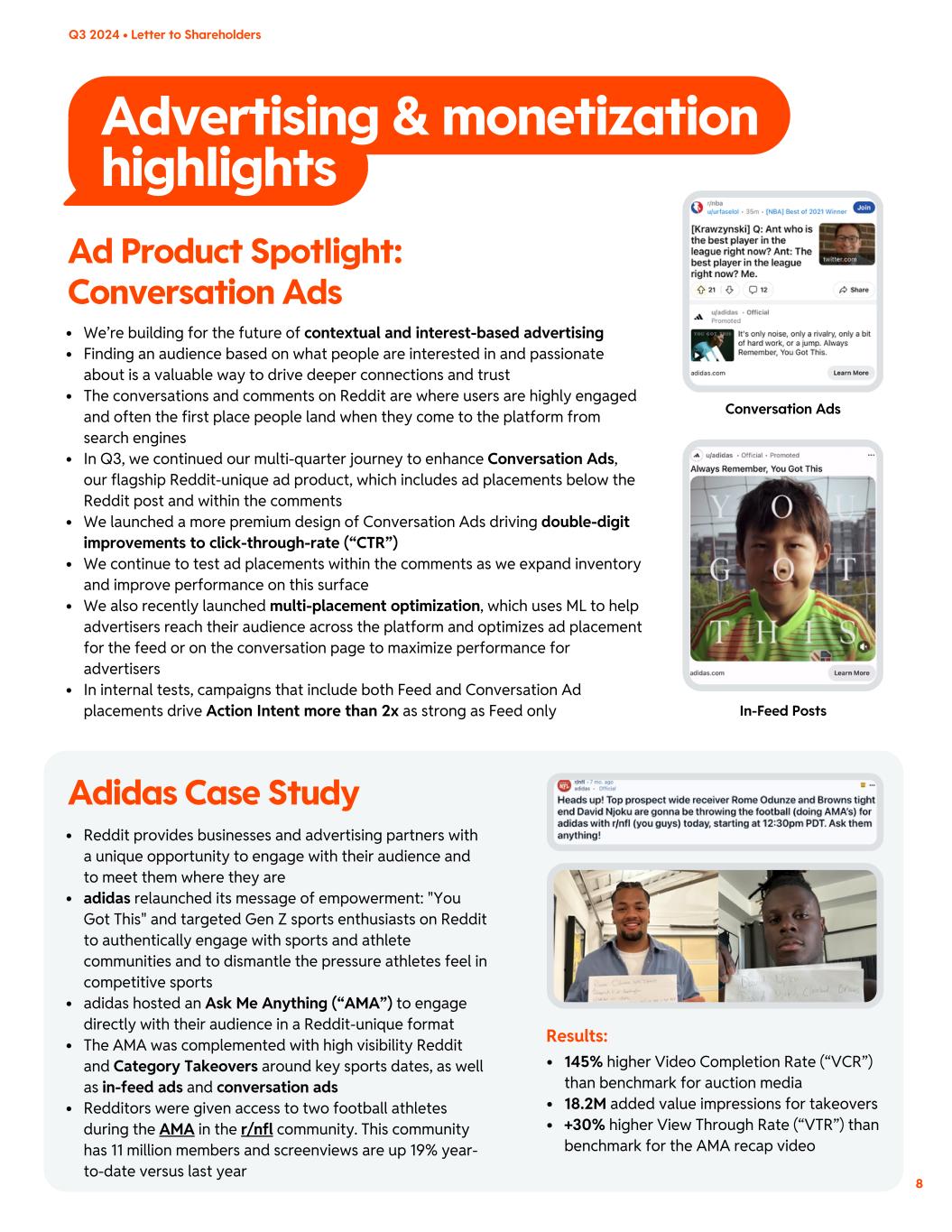 We’re building for the future of contextual and interest-based advertising Finding an audience based on what people are interested in and passionate about is a valuable way to drive deeper connections and trust The conversations and comments on Reddit are where users are highly engaged and often the first place people land when they come to the platform from search engines In Q3, we continued our multi-quarter journey to enhance Conversation Ads, our flagship Reddit-unique ad product, which includes ad placements below the Reddit post and within the comments We launched a more premium design of Conversation Ads driving double-digit improvements to click-through-rate (“CTR”) We continue to test ad placements within the comments as we expand inventory and improve performance on this surface We also recently launched multi-placement optimization, which uses ML to help advertisers reach their audience across the platform and optimizes ad placement for the feed or on the conversation page to maximize performance for advertisers In internal tests, campaigns that include both Feed and Conversation Ad placements drive Action Intent more than 2x as strong as Feed only Advertising & monetization highlights Q3 2024 • Letter to Shareholders Ad Product Spotlight: Conversation Ads Conversation Ads In-Feed Posts Adidas Case Study Reddit provides businesses and advertising partners with a unique opportunity to engage with their audience and to meet them where they are adidas relaunched its message of empowerment: "You Got This" and targeted Gen Z sports enthusiasts on Reddit to authentically engage with sports and athlete communities and to dismantle the pressure athletes feel in competitive sports adidas hosted an Ask Me Anything (“AMA”) to engage directly with their audience in a Reddit-unique format The AMA was complemented with high visibility Reddit and Category Takeovers around key sports dates, as well as in-feed ads and conversation ads Redditors were given access to two football athletes during the AMA in the r/nfl community. This community has 11 million members and screenviews are up 19% year- to-date versus last year 145% higher Video Completion Rate (“VCR”) than benchmark for auction media 18.2M added value impressions for takeovers +30% higher View Through Rate (“VTR”) than benchmark for the AMA recap video Results: 8