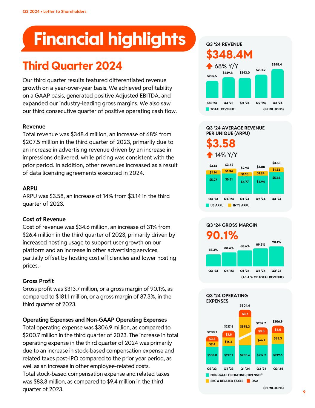 Financial highlights Our third quarter results featured differentiated revenue growth on a year-over-year basis. We achieved profitability on a GAAP basis, generated positive Adjusted EBITDA, and expanded our industry-leading gross margins. We also saw our third consecutive quarter of positive operating cash flow. Revenue Total revenue was $348.4 million, an increase of 68% from $207.5 million in the third quarter of 2023, primarily due to an increase in advertising revenue driven by an increase in impressions delivered, while pricing was consistent with the prior period. In addition, other revenues increased as a result of data licensing agreements executed in 2024. ARPU ARPU was $3.58, an increase of 14% from $3.14 in the third quarter of 2023. Cost of Revenue Cost of revenue was $34.6 million, an increase of 31% from $26.4 million in the third quarter of 2023, primarily driven by increased hosting usage to support user growth on our platform and an increase in other advertising services, partially offset by hosting cost efficiencies and lower hosting prices. Gross Profit Gross profit was $313.7 million, or a gross margin of 90.1%, as compared to $181.1 million, or a gross margin of 87.3%, in the third quarter of 2023. Operating Expenses and Non-GAAP Operating Expenses Total operating expense was $306.9 million, as compared to $200.7 million in the third quarter of 2023. The increase in total operating expense in the third quarter of 2024 was primarily due to an increase in stock-based compensation expense and related taxes post-IPO compared to the prior year period, as well as an increase in other employee-related costs. Total stock-based compensation expense and related taxes was $83.3 million, as compared to $9.4 million in the third quarter of 2023. Third Quarter 2024 Q3 2024 • Letter to Shareholders $348.4M Q3 ‘24 REVENUE 68% Y/Y 14% Y/Y $3.58 Q3 ‘24 AVERAGE REVENUE PER UNIQUE (ARPU) TOTAL REVENUE (IN MILLIONS) SBC & RELATED TAXES NON-GAAP OPERATING EXPENSES³ D&A US ARPU INT’L ARPU $243.0 $2.94 $281.2 $3.08 $348.4 $3.58 $207.5 $3.14 $249.8 $3.42 Q4 '23 Q1 '24 Q2 '24 Q3 '24Q3 '23 90.1% Q3 ‘24 GROSS MARGIN 87.3% 88.4% 88.6% 89.5% 90.1% (AS A % OF TOTAL REVENUE) Q4 '23 Q1 '24 Q2 '24 Q3 '24Q3 '23 Q4 '23 Q1 '24 Q2 '24 Q3' 24Q3 '23 $4.77 $5.88$5.27 $5.51 $4.94 $1.10 $1.32 $1.14 $1.34 $1.24 Q3 ‘24 OPERATING EXPENSES (IN MILLIONS) Q4 '23 Q1 '24 Q2 '24 Q3 '24Q3 '23 $200.7 $217.8 $3.3 $3.8 $4.0$3.8 $3.7 $188.0 $9.4 $197.7 $16.4 $205.6 $595.3 $212.2 $219.6 $83.3$66.7 $306.9$282.7 $804.6 9