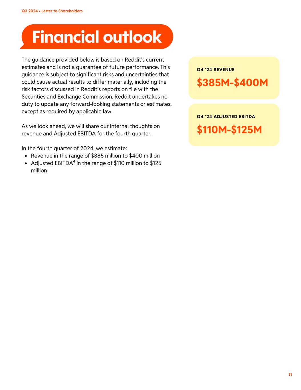 Financial outlook Q4 ‘24 REVENUE $385M-$400M Q4 ‘24 ADJUSTED EBITDA $110M-$125M The guidance provided below is based on Reddit’s current estimates and is not a guarantee of future performance. This guidance is subject to significant risks and uncertainties that could cause actual results to differ materially, including the risk factors discussed in Reddit’s reports on file with the Securities and Exchange Commission. Reddit undertakes no duty to update any forward-looking statements or estimates, except as required by applicable law. As we look ahead, we will share our internal thoughts on revenue and Adjusted EBITDA for the fourth quarter. In the fourth quarter of 2024, we estimate: Revenue in the range of $385 million to $400 million Adjusted EBITDA⁴ in the range of $110 million to $125 million Q3 2024 • Letter to Shareholders 11