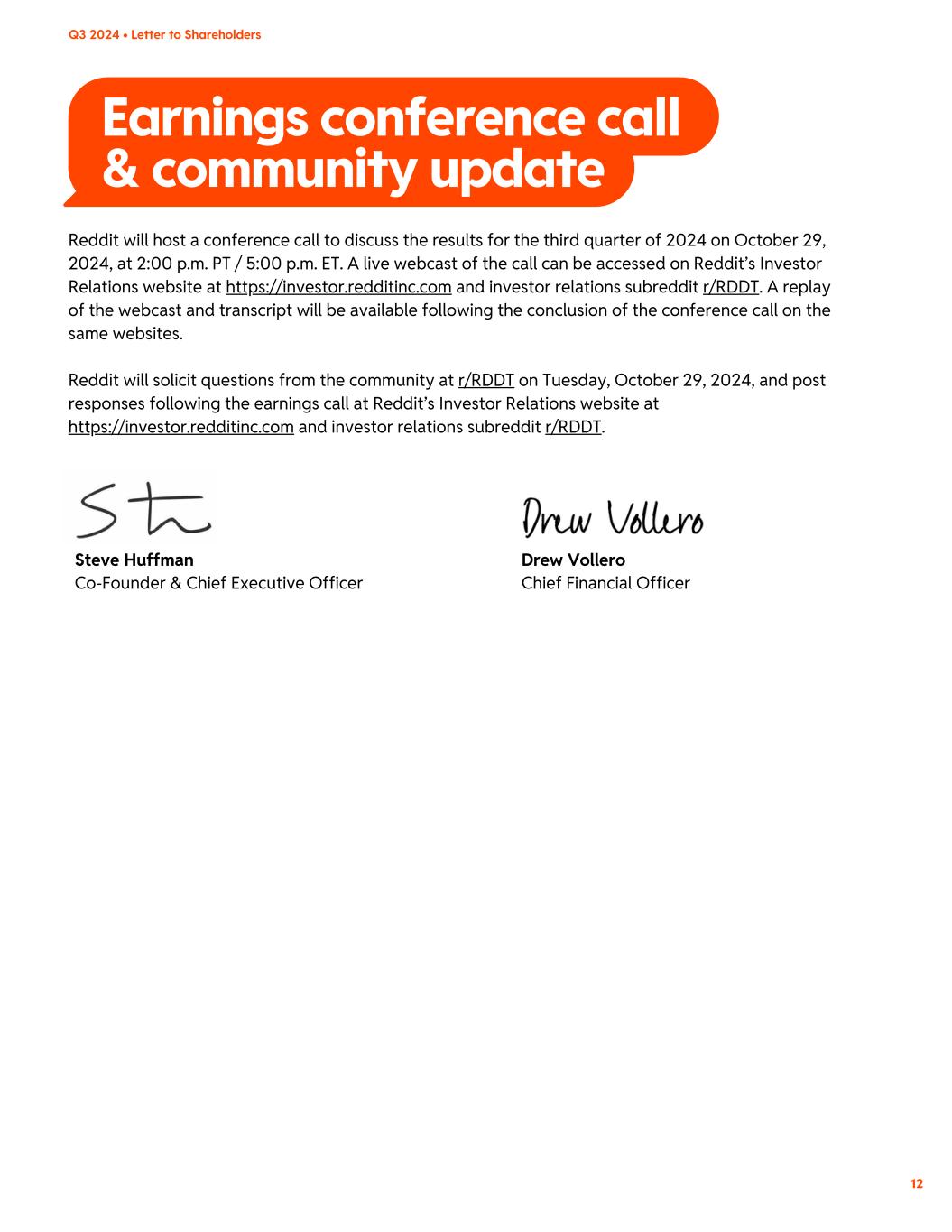 Reddit will host a conference call to discuss the results for the third quarter of 2024 on October 29, 2024, at 2:00 p.m. PT / 5:00 p.m. ET. A live webcast of the call can be accessed on Reddit’s Investor Relations website at https://investor.redditinc.com and investor relations subreddit r/RDDT. A replay of the webcast and transcript will be available following the conclusion of the conference call on the same websites. Reddit will solicit questions from the community at r/RDDT on Tuesday, October 29, 2024, and post responses following the earnings call at Reddit’s Investor Relations website at https://investor.redditinc.com and investor relations subreddit r/RDDT. Steve Huffman Co-Founder & Chief Executive Officer Drew Vollero Chief Financial Officer Q3 2024 • Letter to Shareholders Earnings conference call & community update 12