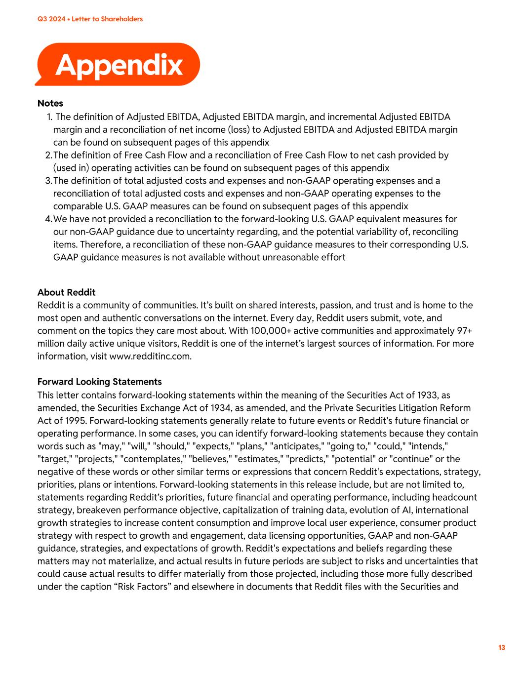 Appendix Notes The definition of Adjusted EBITDA, Adjusted EBITDA margin, and incremental Adjusted EBITDA margin and a reconciliation of net income (loss) to Adjusted EBITDA and Adjusted EBITDA margin can be found on subsequent pages of this appendix 1. The definition of Free Cash Flow and a reconciliation of Free Cash Flow to net cash provided by (used in) operating activities can be found on subsequent pages of this appendix 2. The definition of total adjusted costs and expenses and non-GAAP operating expenses and a reconciliation of total adjusted costs and expenses and non-GAAP operating expenses to the comparable U.S. GAAP measures can be found on subsequent pages of this appendix 3. We have not provided a reconciliation to the forward-looking U.S. GAAP equivalent measures for our non-GAAP guidance due to uncertainty regarding, and the potential variability of, reconciling items. Therefore, a reconciliation of these non-GAAP guidance measures to their corresponding U.S. GAAP guidance measures is not available without unreasonable effort 4. About Reddit Reddit is a community of communities. It’s built on shared interests, passion, and trust and is home to the most open and authentic conversations on the internet. Every day, Reddit users submit, vote, and comment on the topics they care most about. With 100,000+ active communities and approximately 97+ million daily active unique visitors, Reddit is one of the internet’s largest sources of information. For more information, visit www.redditinc.com. Forward Looking Statements This letter contains forward-looking statements within the meaning of the Securities Act of 1933, as amended, the Securities Exchange Act of 1934, as amended, and the Private Securities Litigation Reform Act of 1995. Forward-looking statements generally relate to future events or Reddit's future financial or operating performance. In some cases, you can identify forward-looking statements because they contain words such as "may," "will," "should," "expects," "plans," "anticipates," "going to," "could," "intends," "target," "projects," "contemplates," "believes," "estimates," "predicts," "potential" or "continue" or the negative of these words or other similar terms or expressions that concern Reddit's expectations, strategy, priorities, plans or intentions. Forward-looking statements in this release include, but are not limited to, statements regarding Reddit’s priorities, future financial and operating performance, including headcount strategy, breakeven performance objective, capitalization of training data, evolution of AI, international growth strategies to increase content consumption and improve local user experience, consumer product strategy with respect to growth and engagement, data licensing opportunities, GAAP and non-GAAP guidance, strategies, and expectations of growth. Reddit's expectations and beliefs regarding these matters may not materialize, and actual results in future periods are subject to risks and uncertainties that could cause actual results to differ materially from those projected, including those more fully described under the caption “Risk Factors” and elsewhere in documents that Reddit files with the Securities and Q3 2024 • Letter to Shareholders 13
