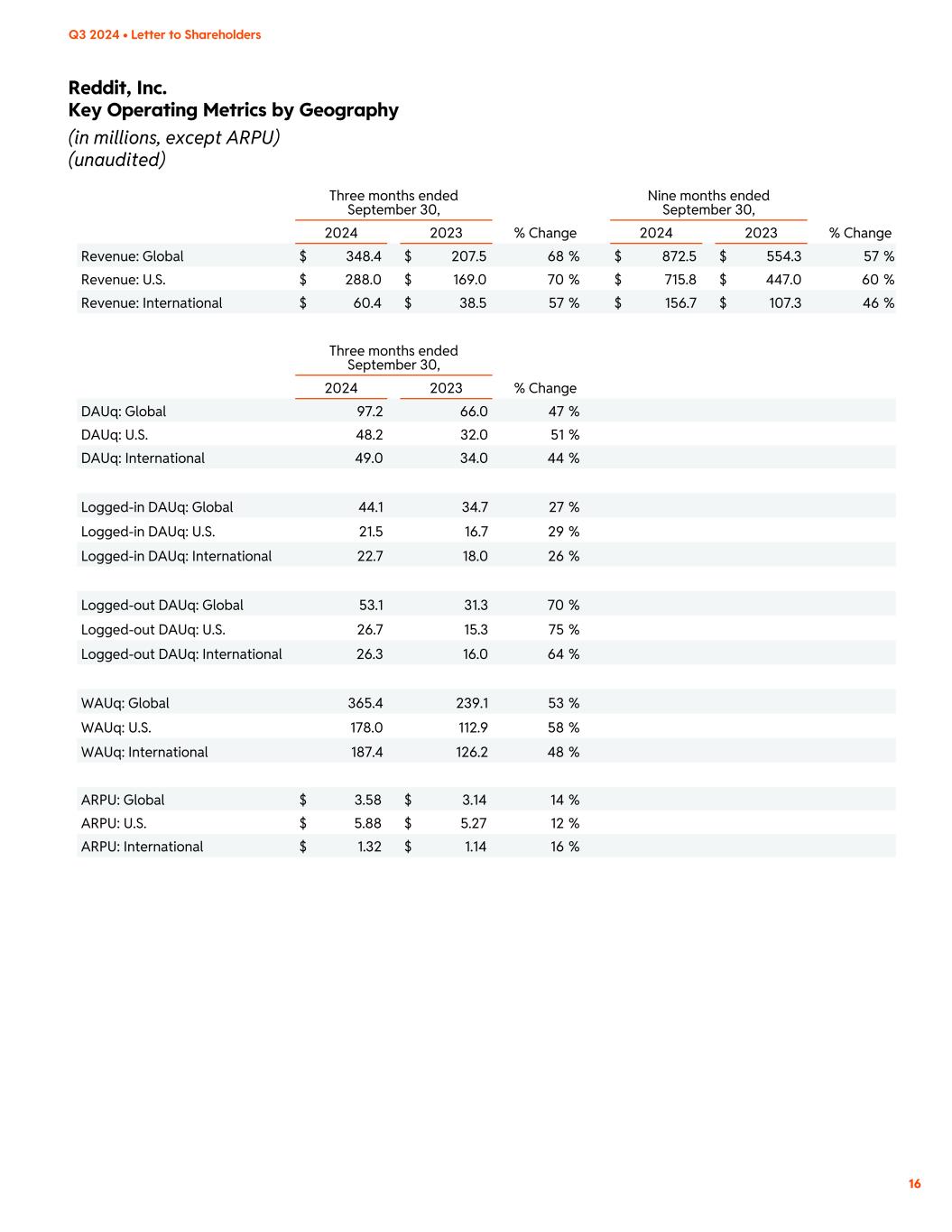 Reddit, Inc. Key Operating Metrics by Geography (in millions, except ARPU) (unaudited) 16 Q3 2024 • Letter to Shareholders Three months ended September 30, Nine months ended September 30, 2024 2023 % Change 2024 2023 % Change Revenue: Global $ 348.4 $ 207.5 68 % $ 872.5 $ 554.3 57 % Revenue: U.S. $ 288.0 $ 169.0 70 % $ 715.8 $ 447.0 60 % Revenue: International $ 60.4 $ 38.5 57 % $ 156.7 $ 107.3 46 % Three months ended September 30, 2024 2023 % Change DAUq: Global 97.2 66.0 47 % DAUq: U.S. 48.2 32.0 51 % DAUq: International 49.0 34.0 44 % Logged-in DAUq: Global 44.1 34.7 27 % Logged-in DAUq: U.S. 21.5 16.7 29 % Logged-in DAUq: International 22.7 18.0 26 % Logged-out DAUq: Global 53.1 31.3 70 % Logged-out DAUq: U.S. 26.7 15.3 75 % Logged-out DAUq: International 26.3 16.0 64 % WAUq: Global 365.4 239.1 53 % WAUq: U.S. 178.0 112.9 58 % WAUq: International 187.4 126.2 48 % ARPU: Global $ 3.58 $ 3.14 14 % ARPU: U.S. $ 5.88 $ 5.27 12 % ARPU: International $ 1.32 $ 1.14 16 %