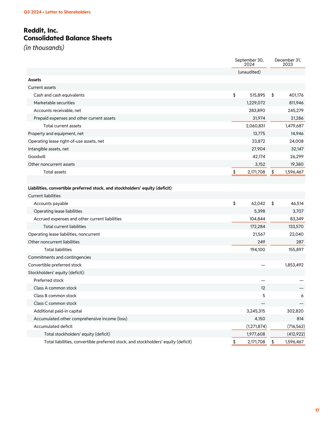 17 Q3 2024 • Letter to Shareholders Reddit, Inc. Consolidated Balance Sheets (in thousands) September 30, 2024 December 31, 2023 (unaudited) Assets Current assets Cash and cash equivalents $ 515,895 $ 401,176 Marketable securities 1,229,072 811,946 Accounts receivable, net 283,890 245,279 Prepaid expenses and other current assets 31,974 21,286 Total current assets 2,060,831 1,479,687 Property and equipment, net 13,775 14,946 Operating lease right-of-use assets, net 23,872 24,008 Intangible assets, net 27,904 32,147 Goodwill 42,174 26,299 Other noncurrent assets 3,152 19,380 Total assets $ 2,171,708 $ 1,596,467 Liabilities, convertible preferred stock, and stockholders’ equity (deficit) Current liabilities Accounts payable $ 62,042 $ 46,514 Operating lease liabilities 5,398 3,707 Accrued expenses and other current liabilities 104,844 83,349 Total current liabilities 172,284 133,570 Operating lease liabilities, noncurrent 21,567 22,040 Other noncurrent liabilities 249 287 Total liabilities 194,100 155,897 Commitments and contingencies Convertible preferred stock — 1,853,492 Stockholders’ equity (deficit): Preferred stock — — Class A common stock 12 — Class B common stock 5 6 Class C common stock — — Additional paid-in capital 3,245,315 302,820 Accumulated other comprehensive income (loss) 4,150 814 Accumulated deficit (1,271,874) (716,562) Total stockholders’ equity (deficit) 1,977,608 (412,922) Total liabilities, convertible preferred stock, and stockholders’ equity (deficit) $ 2,171,708 $ 1,596,467