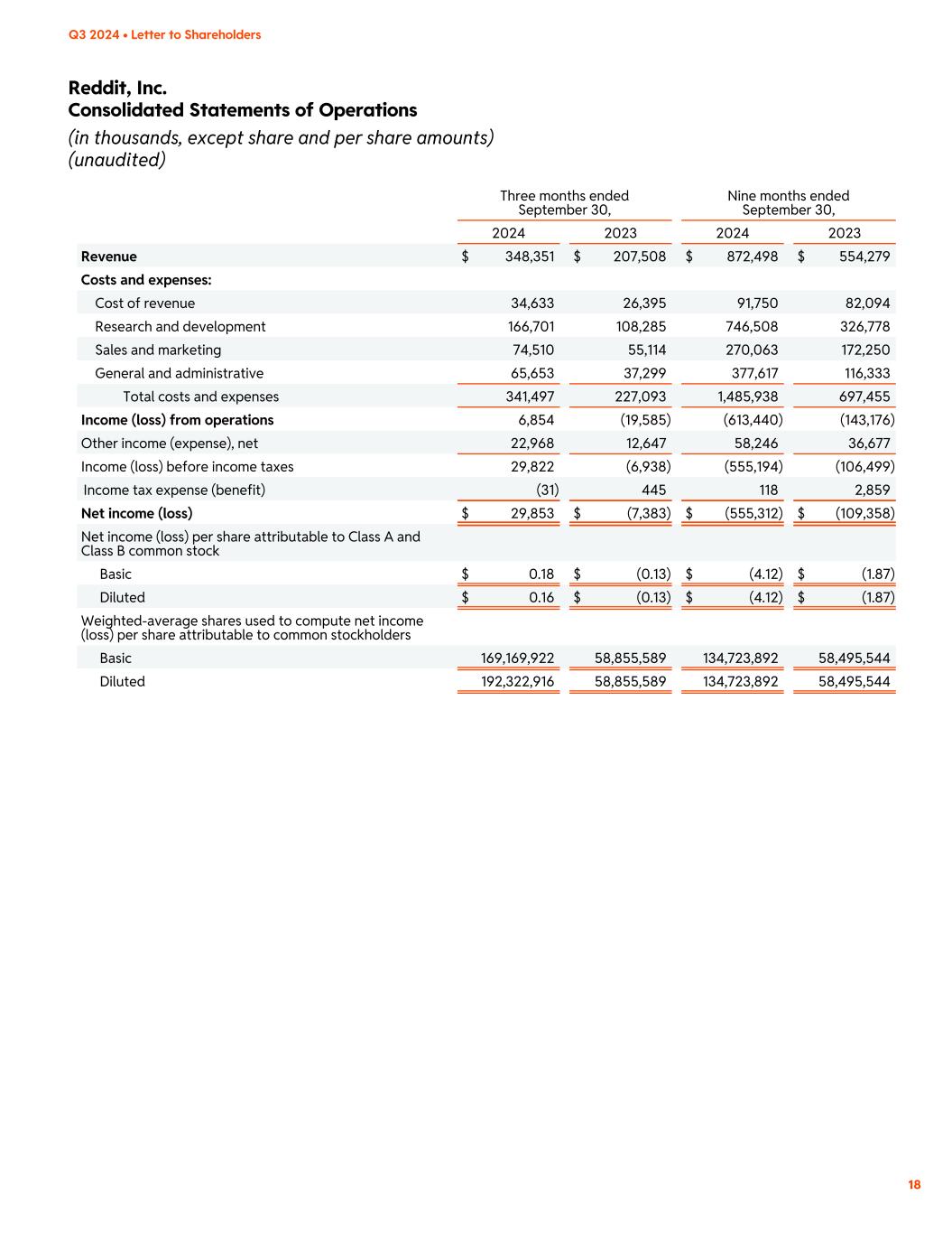 18 Three months ended September 30, Nine months ended September 30, 2024 2023 2024 2023 Revenue $ 348,351 $ 207,508 $ 872,498 $ 554,279 Costs and expenses: Cost of revenue 34,633 26,395 91,750 82,094 Research and development 166,701 108,285 746,508 326,778 Sales and marketing 74,510 55,114 270,063 172,250 General and administrative 65,653 37,299 377,617 116,333 Total costs and expenses 341,497 227,093 1,485,938 697,455 Income (loss) from operations 6,854 (19,585) (613,440) (143,176) Other income (expense), net 22,968 12,647 58,246 36,677 Income (loss) before income taxes 29,822 (6,938) (555,194) (106,499) Income tax expense (benefit) (31) 445 118 2,859 Net income (loss) $ 29,853 $ (7,383) $ (555,312) $ (109,358) Net income (loss) per share attributable to Class A and Class B common stock Basic $ 0.18 $ (0.13) $ (4.12) $ (1.87) Diluted $ 0.16 $ (0.13) $ (4.12) $ (1.87) Weighted-average shares used to compute net income (loss) per share attributable to common stockholders Basic 169,169,922 58,855,589 134,723,892 58,495,544 Diluted 192,322,916 58,855,589 134,723,892 58,495,544 Q3 2024 • Letter to Shareholders Reddit, Inc. Consolidated Statements of Operations (in thousands, except share and per share amounts) (unaudited)