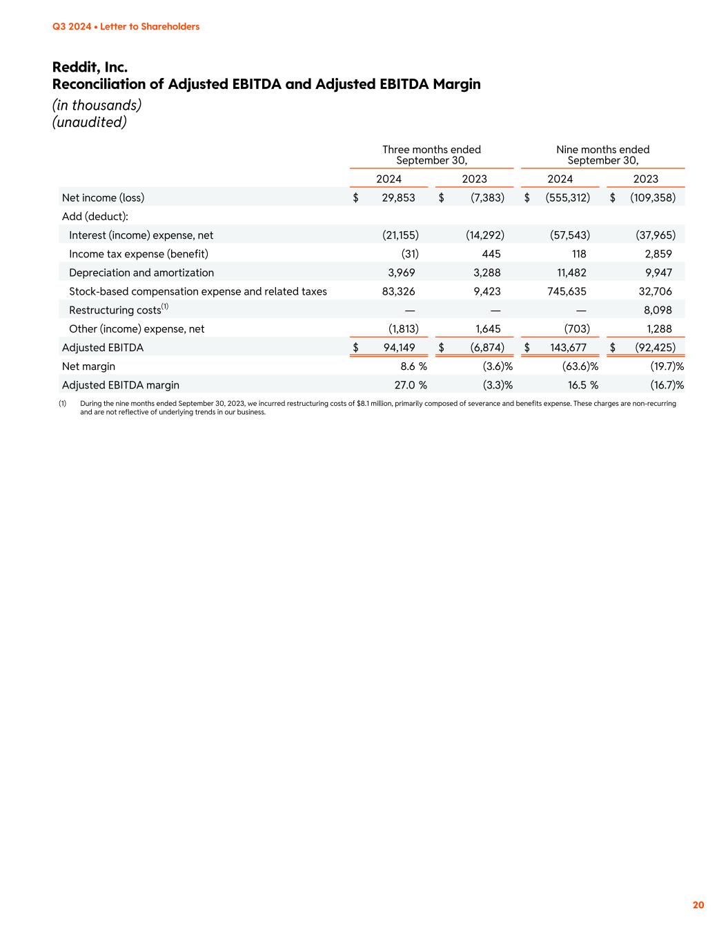 20 Q3 2024 • Letter to Shareholders Reddit, Inc. Reconciliation of Adjusted EBITDA and Adjusted EBITDA Margin (in thousands) (unaudited) Three months ended September 30, Nine months ended September 30, 2024 2023 2024 2023 Net income (loss) $ 29,853 $ (7,383) $ (555,312) $ (109,358) Add (deduct): Interest (income) expense, net (21,155) (14,292) (57,543) (37,965) Income tax expense (benefit) (31) 445 118 2,859 Depreciation and amortization 3,969 3,288 11,482 9,947 Stock-based compensation expense and related taxes 83,326 9,423 745,635 32,706 Restructuring costs(1) — — — 8,098 Other (income) expense, net (1,813) 1,645 (703) 1,288 Adjusted EBITDA $ 94,149 $ (6,874) $ 143,677 $ (92,425) Net margin 8.6 % (3.6) % (63.6) % (19.7) % Adjusted EBITDA margin 27.0 % (3.3) % 16.5 % (16.7) % (1) During the nine months ended September 30, 2023, we incurred restructuring costs of $8.1 million, primarily composed of severance and benefits expense. These charges are non-recurring and are not reflective of underlying trends in our business.