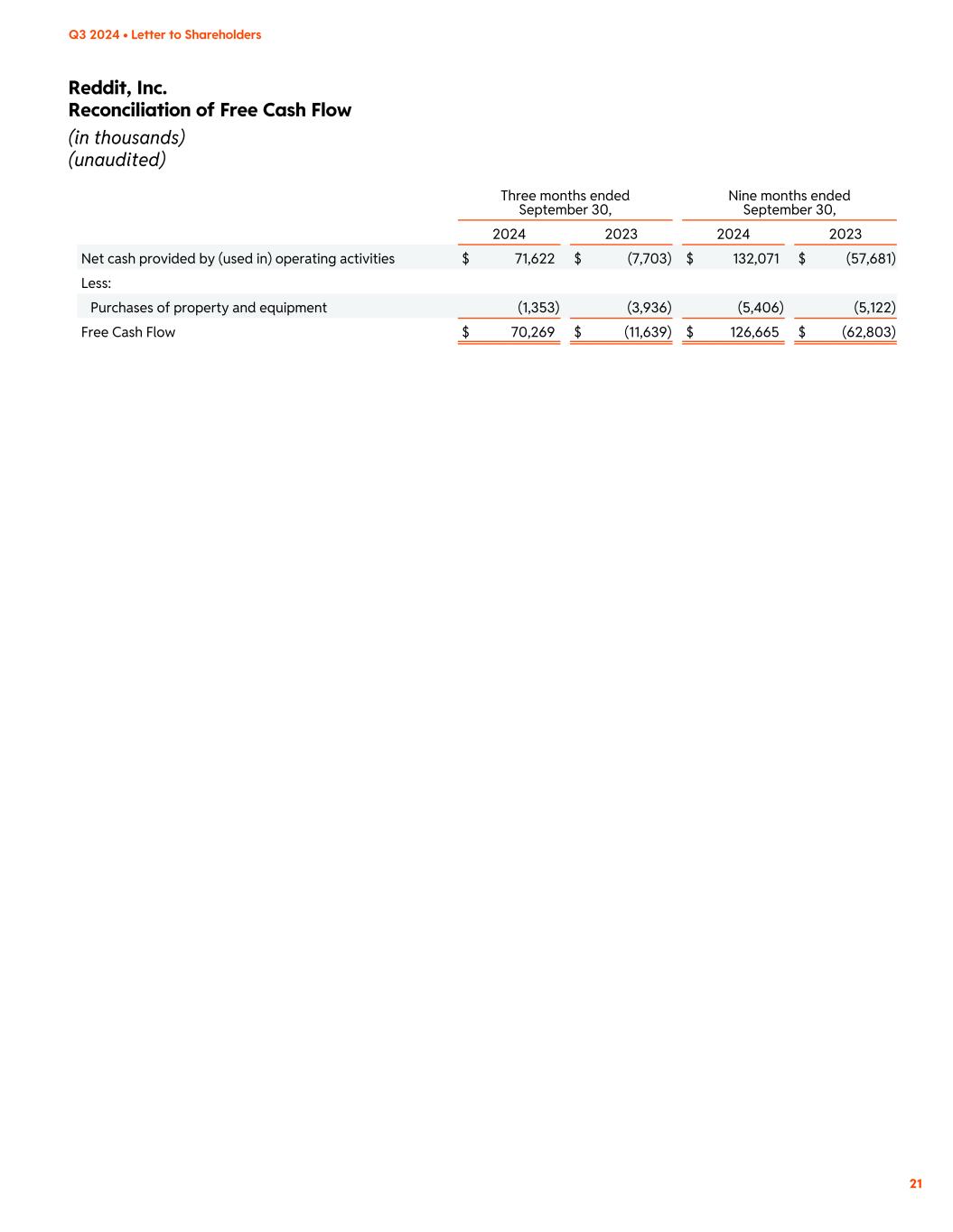 21 Q3 2024 • Letter to Shareholders Reddit, Inc. Reconciliation of Free Cash Flow (in thousands) (unaudited) Three months ended September 30, Nine months ended September 30, 2024 2023 2024 2023 Net cash provided by (used in) operating activities $ 71,622 $ (7,703) $ 132,071 $ (57,681) Less: Purchases of property and equipment (1,353) (3,936) (5,406) (5,122) Free Cash Flow $ 70,269 $ (11,639) $ 126,665 $ (62,803)