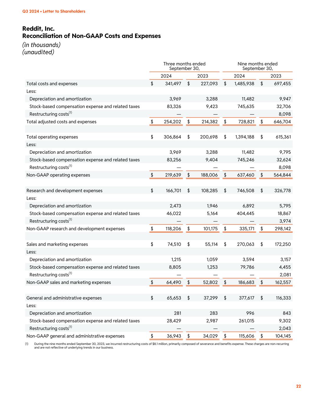 22 Q3 2024 • Letter to Shareholders Reddit, Inc. Reconciliation of Non-GAAP Costs and Expenses (in thousands) (unaudited) Three months ended September 30, Nine months ended September 30, 2024 2023 2024 2023 Total costs and expenses $ 341,497 $ 227,093 $ 1,485,938 $ 697,455 Less: Depreciation and amortization 3,969 3,288 11,482 9,947 Stock-based compensation expense and related taxes 83,326 9,423 745,635 32,706 Restructuring costs(1) — — — 8,098 Total adjusted costs and expenses $ 254,202 $ 214,382 $ 728,821 $ 646,704 Total operating expenses $ 306,864 $ 200,698 $ 1,394,188 $ 615,361 Less: Depreciation and amortization 3,969 3,288 11,482 9,795 Stock-based compensation expense and related taxes 83,256 9,404 745,246 32,624 Restructuring costs(1) — — — 8,098 Non-GAAP operating expenses $ 219,639 $ 188,006 $ 637,460 $ 564,844 Research and development expenses $ 166,701 $ 108,285 $ 746,508 $ 326,778 Less: Depreciation and amortization 2,473 1,946 6,892 5,795 Stock-based compensation expense and related taxes 46,022 5,164 404,445 18,867 Restructuring costs(1) — — — 3,974 Non-GAAP research and development expenses $ 118,206 $ 101,175 $ 335,171 $ 298,142 Sales and marketing expenses $ 74,510 $ 55,114 $ 270,063 $ 172,250 Less: Depreciation and amortization 1,215 1,059 3,594 3,157 Stock-based compensation expense and related taxes 8,805 1,253 79,786 4,455 Restructuring costs(1) — — — 2,081 Non-GAAP sales and marketing expenses $ 64,490 $ 52,802 $ 186,683 $ 162,557 General and administrative expenses $ 65,653 $ 37,299 $ 377,617 $ 116,333 Less: Depreciation and amortization 281 283 996 843 Stock-based compensation expense and related taxes 28,429 2,987 261,015 9,302 Restructuring costs(1) — — — 2,043 Non-GAAP general and administrative expenses $ 36,943 $ 34,029 $ 115,606 $ 104,145 (1) During the nine months ended September 30, 2023, we incurred restructuring costs of $8.1 million, primarily composed of severance and benefits expense. These charges are non-recurring and are not reflective of underlying trends in our business.