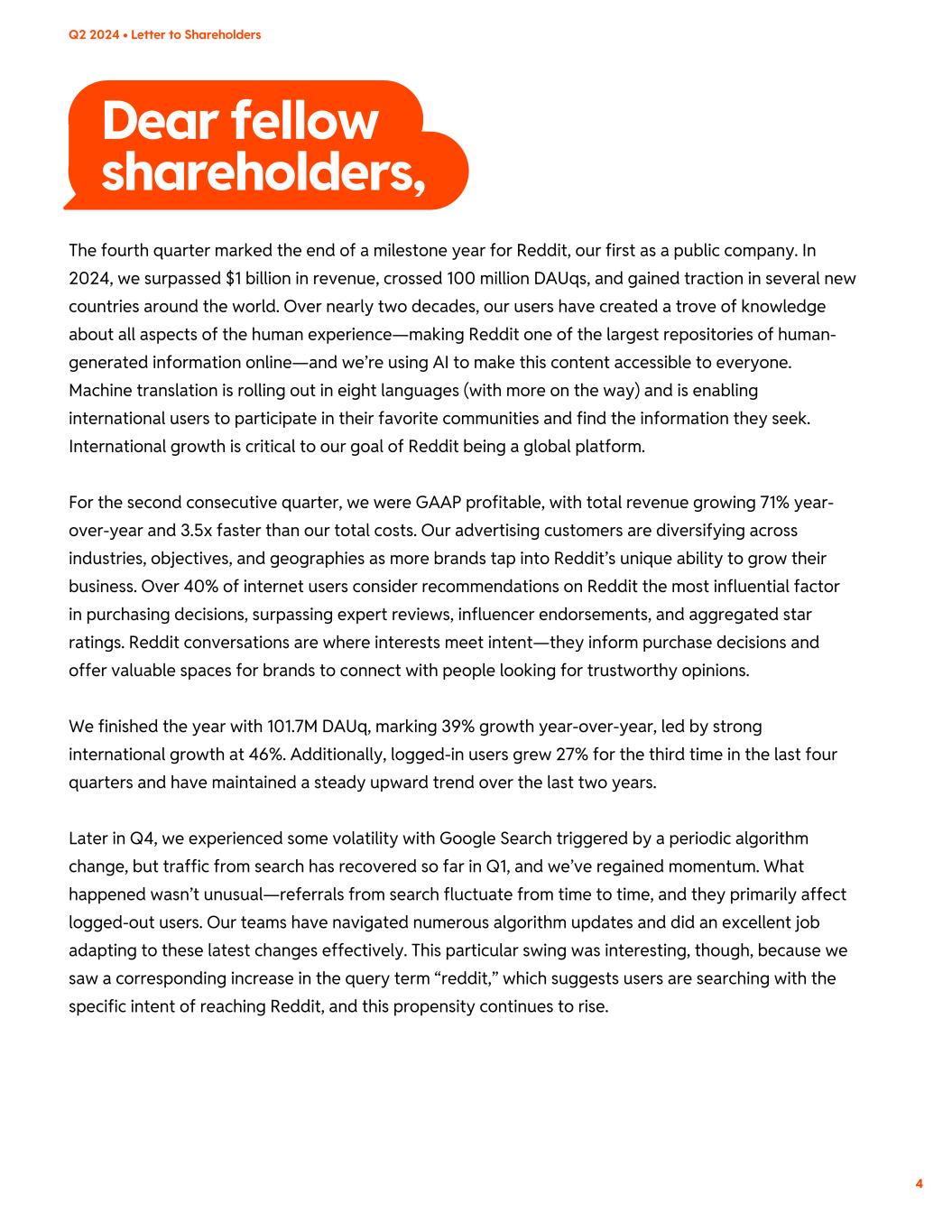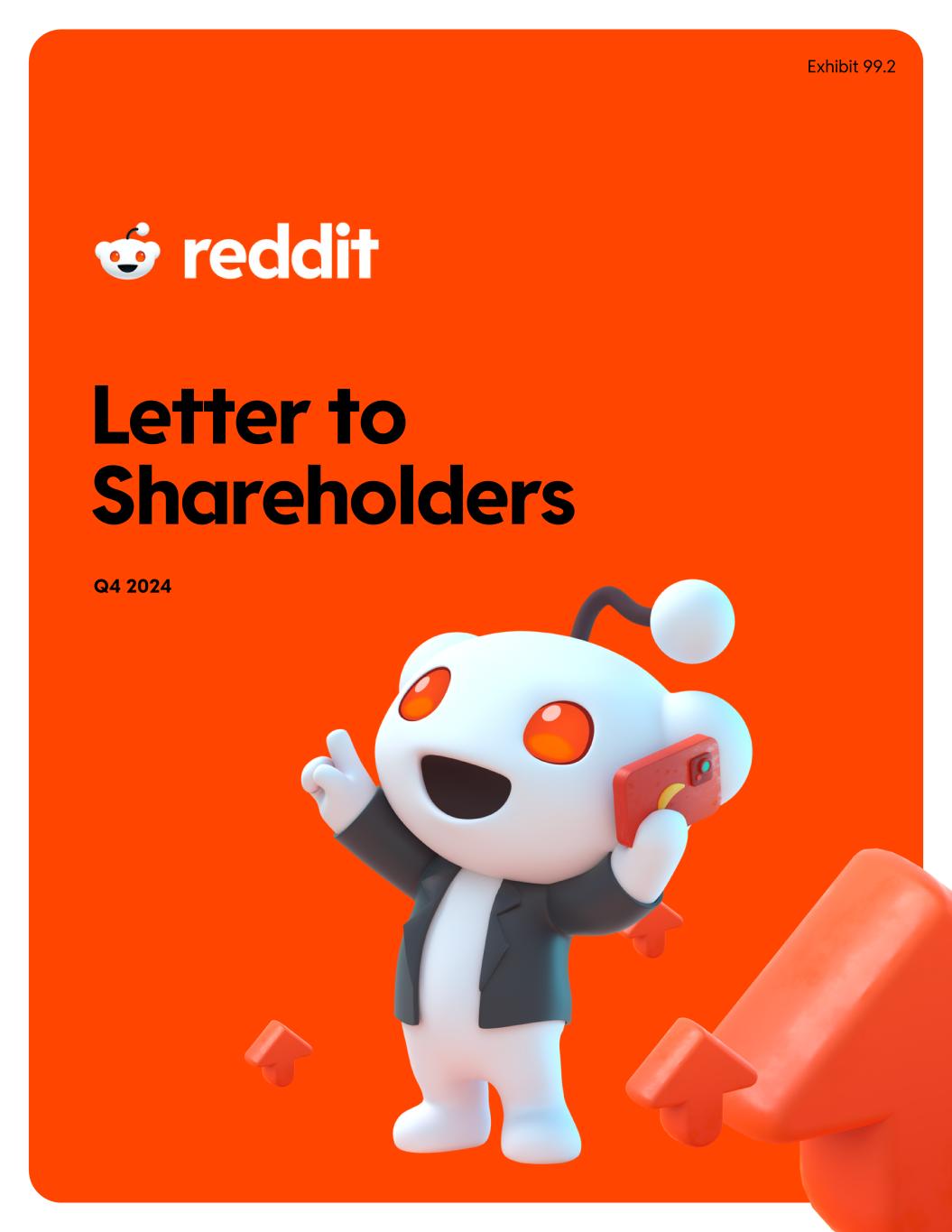 Dear fellow shareholders, 4 Q2 2024 • Letter to Shareholders The fourth quarter marked the end of a milestone year for Reddit, our first as a public company. In 2024, we surpassed $1 billion in revenue, crossed 100 million DAUqs, and gained traction in several new countries around the world. Over nearly two decades, our users have created a trove of knowledge about all aspects of the human experience—making Reddit one of the largest repositories of human- generated information online—and we’re using AI to make this content accessible to everyone. Machine translation is rolling out in eight languages (with more on the way) and is enabling international users to participate in their favorite communities and find the information they seek. International growth is critical to our goal of Reddit being a global platform. For the second consecutive quarter, we were GAAP profitable, with total revenue growing 71% year- over-year and 3.5x faster than our total costs. Our advertising customers are diversifying across industries, objectives, and geographies as more brands tap into Reddit’s unique ability to grow their business. Over 40% of internet users consider recommendations on Reddit the most influential factor in purchasing decisions, surpassing expert reviews, influencer endorsements, and aggregated star ratings. Reddit conversations are where interests meet intent—they inform purchase decisions and offer valuable spaces for brands to connect with people looking for trustworthy opinions. We finished the year with 101.7M DAUq, marking 39% growth year-over-year, led by strong international growth at 46%. Additionally, logged-in users grew 27% for the third time in the last four quarters and have maintained a steady upward trend over the last two years. Later in Q4, we experienced some volatility with Google Search triggered by a periodic algorithm change, but traffic from search has recovered so far in Q1, and we’ve regained momentum. What happened wasn’t unusual—referrals from search fluctuate from time to time, and they primarily affect logged-out users. Our teams have navigated numerous algorithm updates and did an excellent job adapting to these latest changes effectively. This particular swing was interesting, though, because we saw a corresponding increase in the query term “reddit,” which suggests users are searching with the specific intent of reaching Reddit, and this propensity continues to rise.
