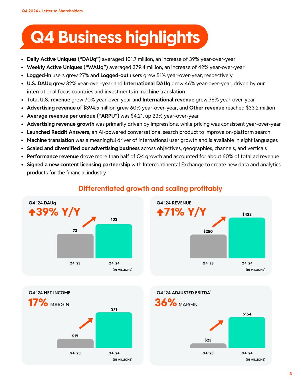 3 Q4 2024 • Letter to Shareholders Q4 Business highlights 39% Y/Y 71% Y/Y 17% 36%MARGIN MARGIN Daily Active Uniques (“DAUq”) averaged 101.7 million, an increase of 39% year-over-year Weekly Active Uniques (“WAUq”) averaged 379.4 million, an increase of 42% year-over-year Logged-in users grew 27% and Logged-out users grew 51% year-over-year, respectively U.S. DAUq grew 32% year-over-year and International DAUq grew 46% year-over-year, driven by our international focus countries and investments in machine translation Total U.S. revenue grew 70% year-over-year and International revenue grew 76% year-over-year Advertising revenue of $394.5 million grew 60% year-over-year, and Other revenue reached $33.2 million Average revenue per unique (“ARPU”) was $4.21, up 23% year-over-year Advertising revenue growth was primarily driven by impressions, while pricing was consistent year-over-year Launched Reddit Answers, an AI-powered conversational search product to improve on-platform search Machine translation was a meaningful driver of international user growth and is available in eight languages Scaled and diversified our advertising business across objectives, geographies, channels, and verticals Performance revenue drove more than half of Q4 growth and accounted for about 60% of total ad revenue Signed a new content licensing partnership with Intercontinental Exchange to create new data and analytics products for the financial industry Q4 ‘24 DAUq Q4 ‘24 NET INCOME Q4 ‘24 ADJUSTED EBITDA¹ Q4 ‘24 REVENUE (IN MILLIONS) (IN MILLIONS) (IN MILLIONS) (IN MILLIONS) Q4 ‘23 Q4 ‘23 Q4 ‘23 Q4 ‘23Q4 '24 Q4 '24 Q4 '24 Q4 '24 102 $71 $154 $428 73 $19 $23 $250 Differentiated growth and scaling profitably