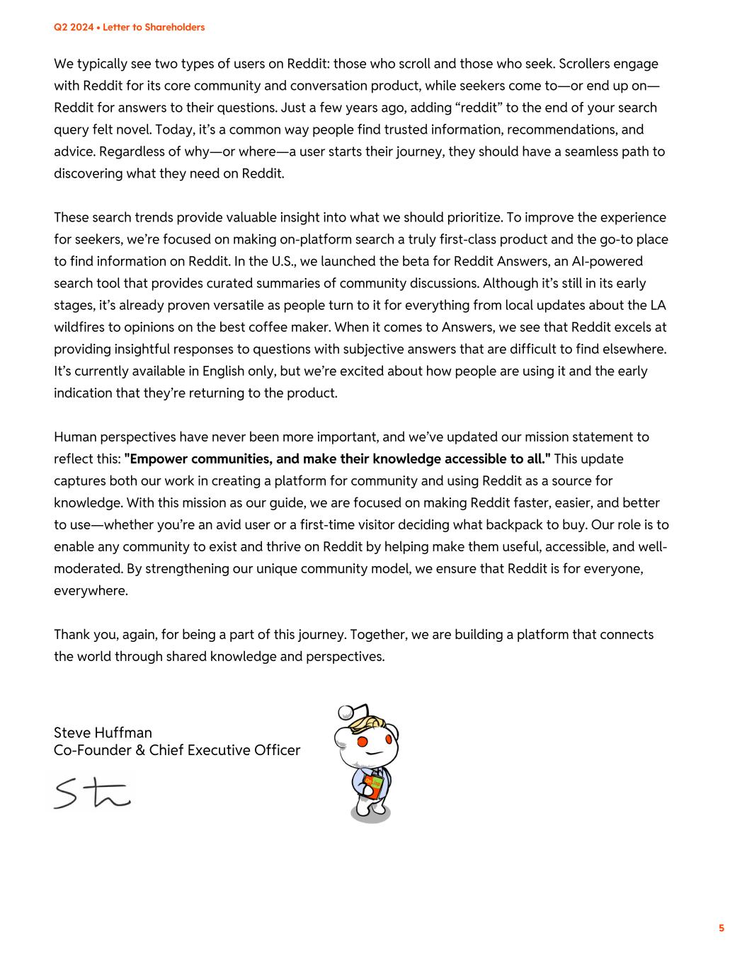 We typically see two types of users on Reddit: those who scroll and those who seek. Scrollers engage with Reddit for its core community and conversation product, while seekers come to—or end up on— Reddit for answers to their questions. Just a few years ago, adding “reddit” to the end of your search query felt novel. Today, it’s a common way people find trusted information, recommendations, and advice. Regardless of why—or where—a user starts their journey, they should have a seamless path to discovering what they need on Reddit. These search trends provide valuable insight into what we should prioritize. To improve the experience for seekers, we’re focused on making on-platform search a truly first-class product and the go-to place to find information on Reddit. In the U.S., we launched the beta for Reddit Answers, an AI-powered search tool that provides curated summaries of community discussions. Although it’s still in its early stages, it’s already proven versatile as people turn to it for everything from local updates about the LA wildfires to opinions on the best coffee maker. When it comes to Answers, we see that Reddit excels at providing insightful responses to questions with subjective answers that are difficult to find elsewhere. It’s currently available in English only, but we’re excited about how people are using it and the early indication that they’re returning to the product. Human perspectives have never been more important, and we’ve updated our mission statement to reflect this: "Empower communities, and make their knowledge accessible to all." This update captures both our work in creating a platform for community and using Reddit as a source for knowledge. With this mission as our guide, we are focused on making Reddit faster, easier, and better to use—whether you’re an avid user or a first-time visitor deciding what backpack to buy. Our role is to enable any community to exist and thrive on Reddit by helping make them useful, accessible, and well- moderated. By strengthening our unique community model, we ensure that Reddit is for everyone, everywhere. Thank you, again, for being a part of this journey. Together, we are building a platform that connects the world through shared knowledge and perspectives. 5 Steve Huffman Co-Founder & Chief Executive Officer Q2 2024 • Letter to Shareholders