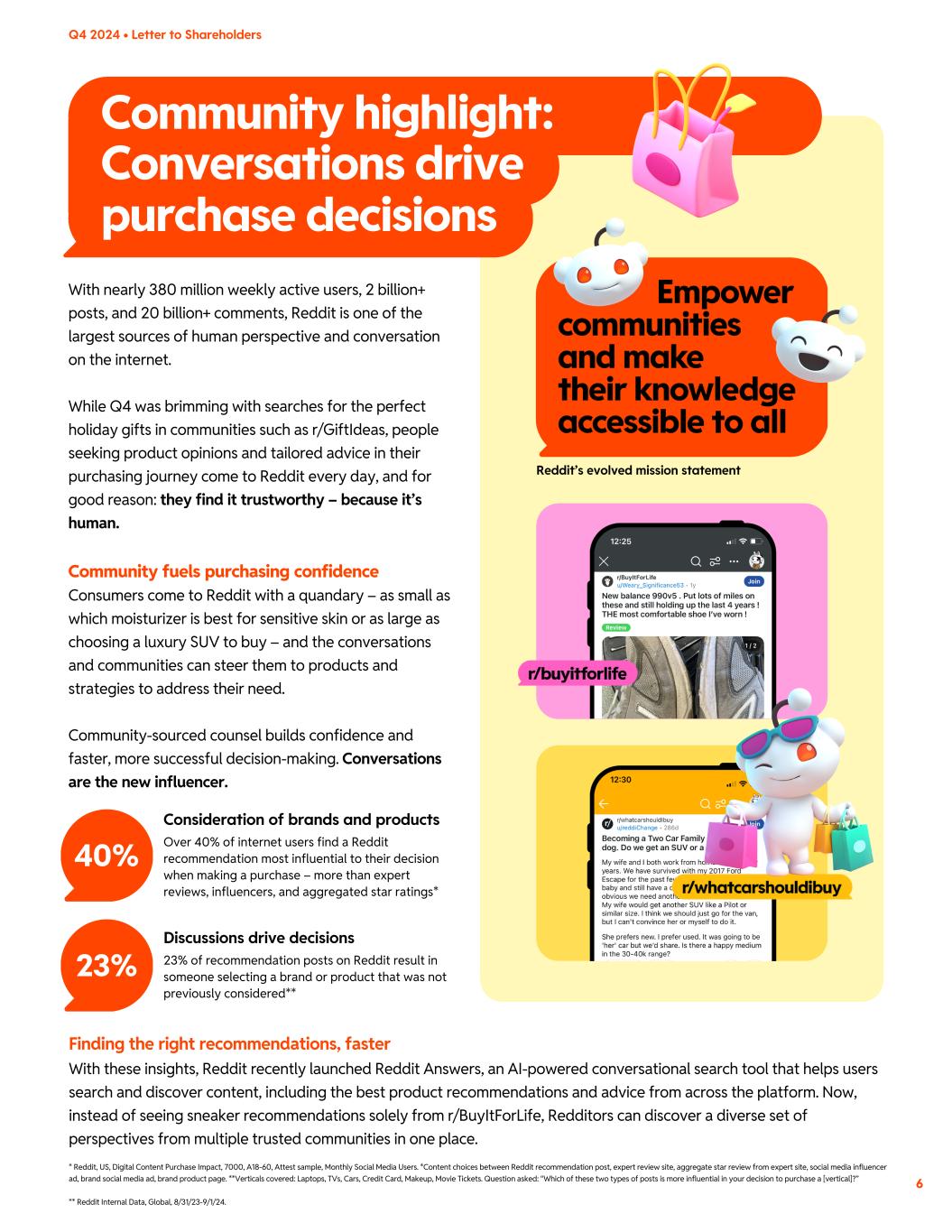 Community highlight: Conversations drive purchase decisions 40% Consideration of brands and products Over 40% of internet users find a Reddit recommendation most influential to their decision when making a purchase – more than expert reviews, influencers, and aggregated star ratings* 23% Discussions drive decisions 23% of recommendation posts on Reddit result in someone selecting a brand or product that was not previously considered** With nearly 380 million weekly active users, 2 billion+ posts, and 20 billion+ comments, Reddit is one of the largest sources of human perspective and conversation on the internet. While Q4 was brimming with searches for the perfect holiday gifts in communities such as r/GiftIdeas, people seeking product opinions and tailored advice in their purchasing journey come to Reddit every day, and for good reason: they find it trustworthy – because it’s human. Community fuels purchasing confidence Consumers come to Reddit with a quandary – as small as which moisturizer is best for sensitive skin or as large as choosing a luxury SUV to buy – and the conversations and communities can steer them to products and strategies to address their need. Community-sourced counsel builds confidence and faster, more successful decision-making. Conversations are the new influencer. Finding the right recommendations, faster With these insights, Reddit recently launched Reddit Answers, an AI-powered conversational search tool that helps users search and discover content, including the best product recommendations and advice from across the platform. Now, instead of seeing sneaker recommendations solely from r/BuyItForLife, Redditors can discover a diverse set of perspectives from multiple trusted communities in one place. * Reddit, US, Digital Content Purchase Impact, 7000, A18-60, Attest sample, Monthly Social Media Users. *Content choices between Reddit recommendation post, expert review site, aggregate star review from expert site, social media influencer ad, brand social media ad, brand product page. **Verticals covered: Laptops, TVs, Cars, Credit Card, Makeup, Movie Tickets. Question asked: “Which of these two types of posts is more influential in your decision to purchase a [vertical]?” ** Reddit Internal Data, Global, 8/31/23-9/1/24. Q4 2024 • Letter to Shareholders Reddit’s evolved mission statement 6
