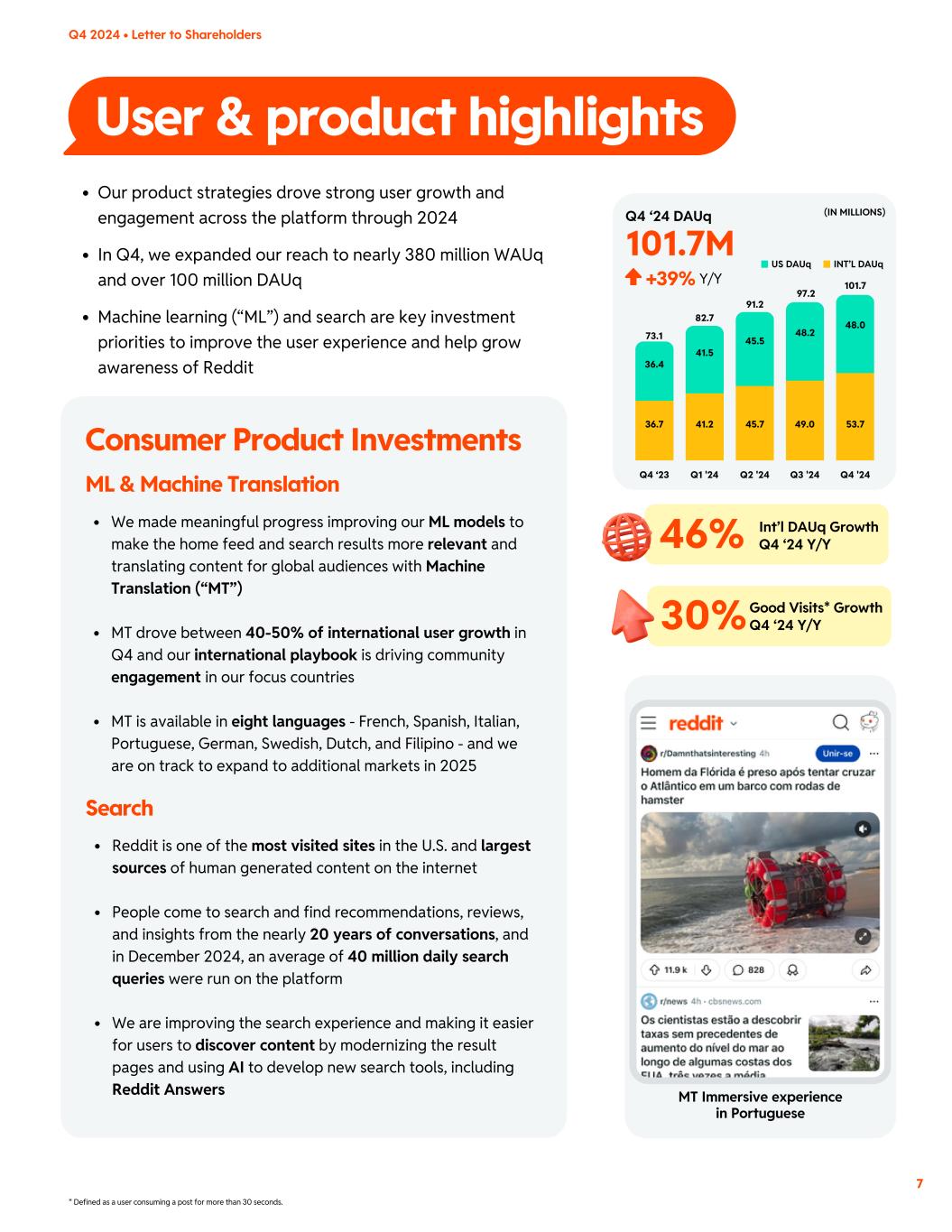 User & product highlights Our product strategies drove strong user growth and engagement across the platform through 2024 In Q4, we expanded our reach to nearly 380 million WAUq and over 100 million DAUq Machine learning (“ML”) and search are key investment priorities to improve the user experience and help grow awareness of Reddit 46% Int’l DAUq Growth Q4 ‘24 Y/Y (IN MILLIONS) US DAUq INT’L DAUq Q4 2024 • Letter to Shareholders Consumer Product Investments ML & Machine Translation Search 48.0 Q4 ‘23 Q1 '24 Q3 '24Q2 '24 Q4 '24 36.4 41.5 45.5 48.2 53.736.7 41.2 45.7 49.0 101.7 73.1 82.7 91.2 97.2 Q4 ‘24 DAUq 101.7M Y/Y+39% * Defined as a user consuming a post for more than 30 seconds. 7 MT Immersive experience in Portuguese Good Visits* Growth Q4 ‘24 Y/Y30% Reddit is one of the most visited sites in the U.S. and largest sources of human generated content on the internet People come to search and find recommendations, reviews, and insights from the nearly 20 years of conversations, and in December 2024, an average of 40 million daily search queries were run on the platform We are improving the search experience and making it easier for users to discover content by modernizing the result pages and using AI to develop new search tools, including Reddit Answers We made meaningful progress improving our ML models to make the home feed and search results more relevant and translating content for global audiences with Machine Translation (“MT”) MT drove between 40-50% of international user growth in Q4 and our international playbook is driving community engagement in our focus countries MT is available in eight languages - French, Spanish, Italian, Portuguese, German, Swedish, Dutch, and Filipino - and we are on track to expand to additional markets in 2025